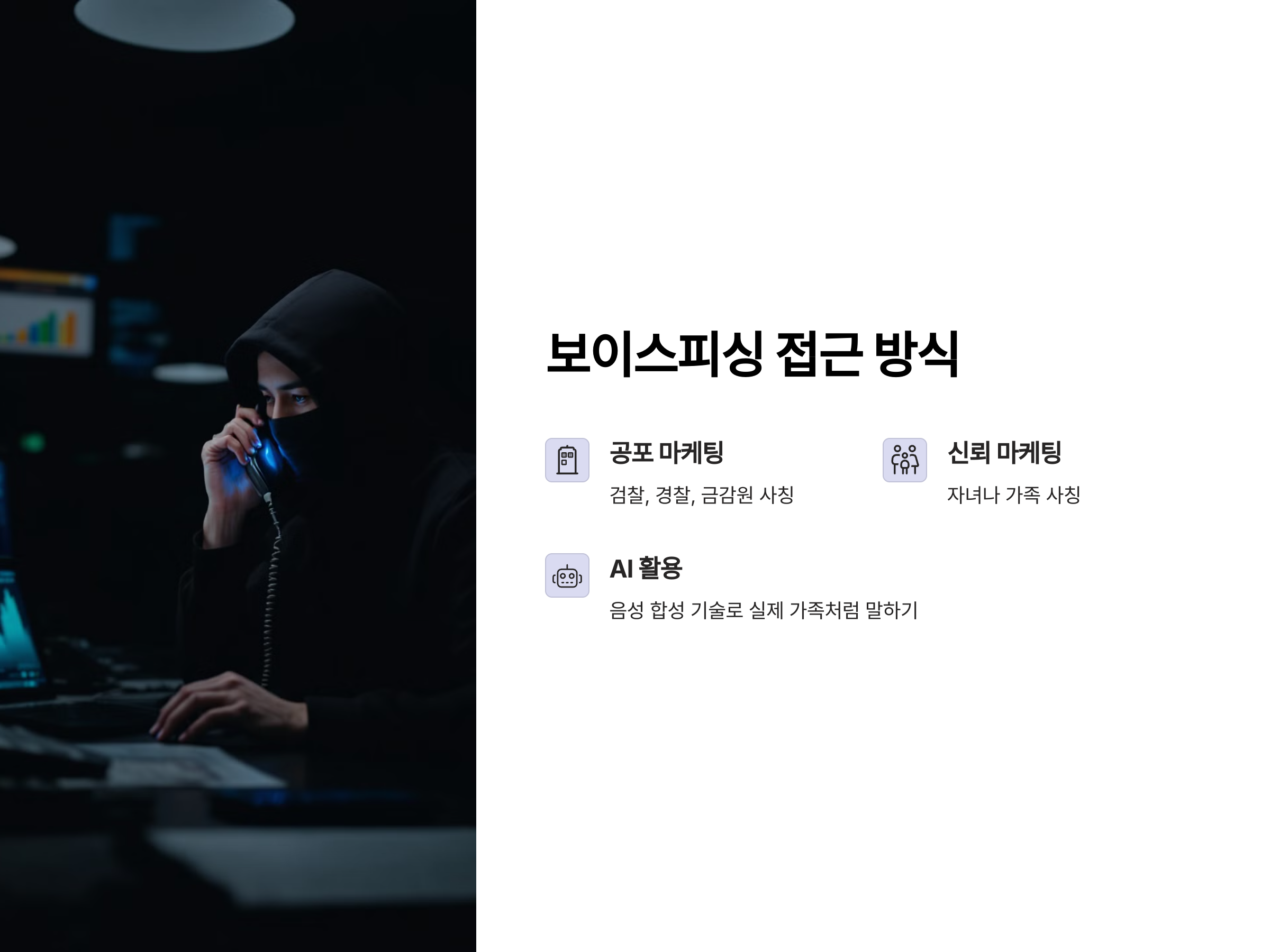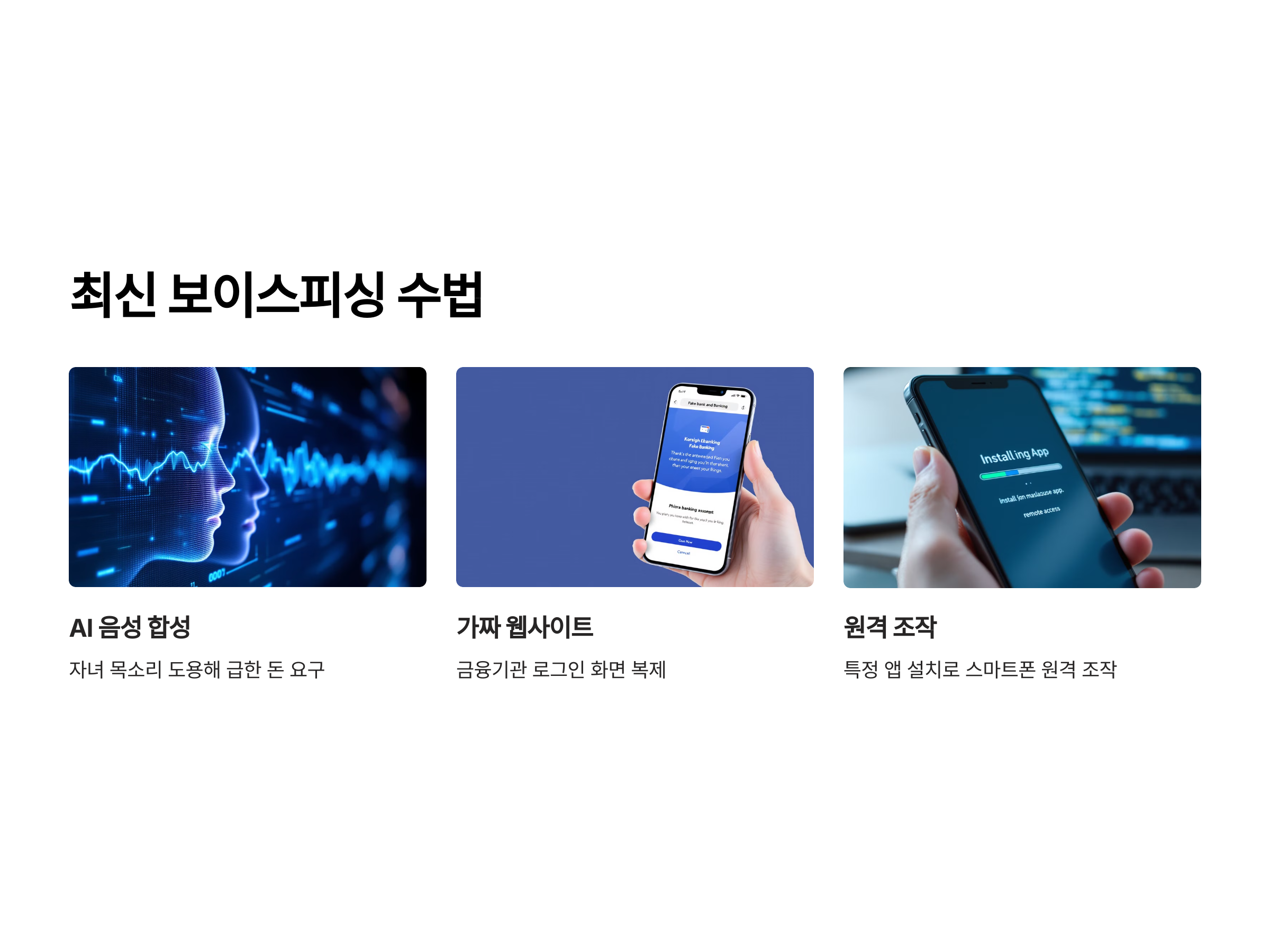 2024년 이후 보이스피싱 범죄는 AI를 활용한 ‘음성 합성 기술’을 사용하여 피해자를 속이고 있습니다. 예를 들어 자녀의 목소리를 도용하여 “지금 급한 일이 생겼어, 돈 좀 보내줘”라는 식으로 감정에 호소하는 전화가 발생하고 있으며, 이로 인한 피해 금액은 수억 원대에 이릅니다.