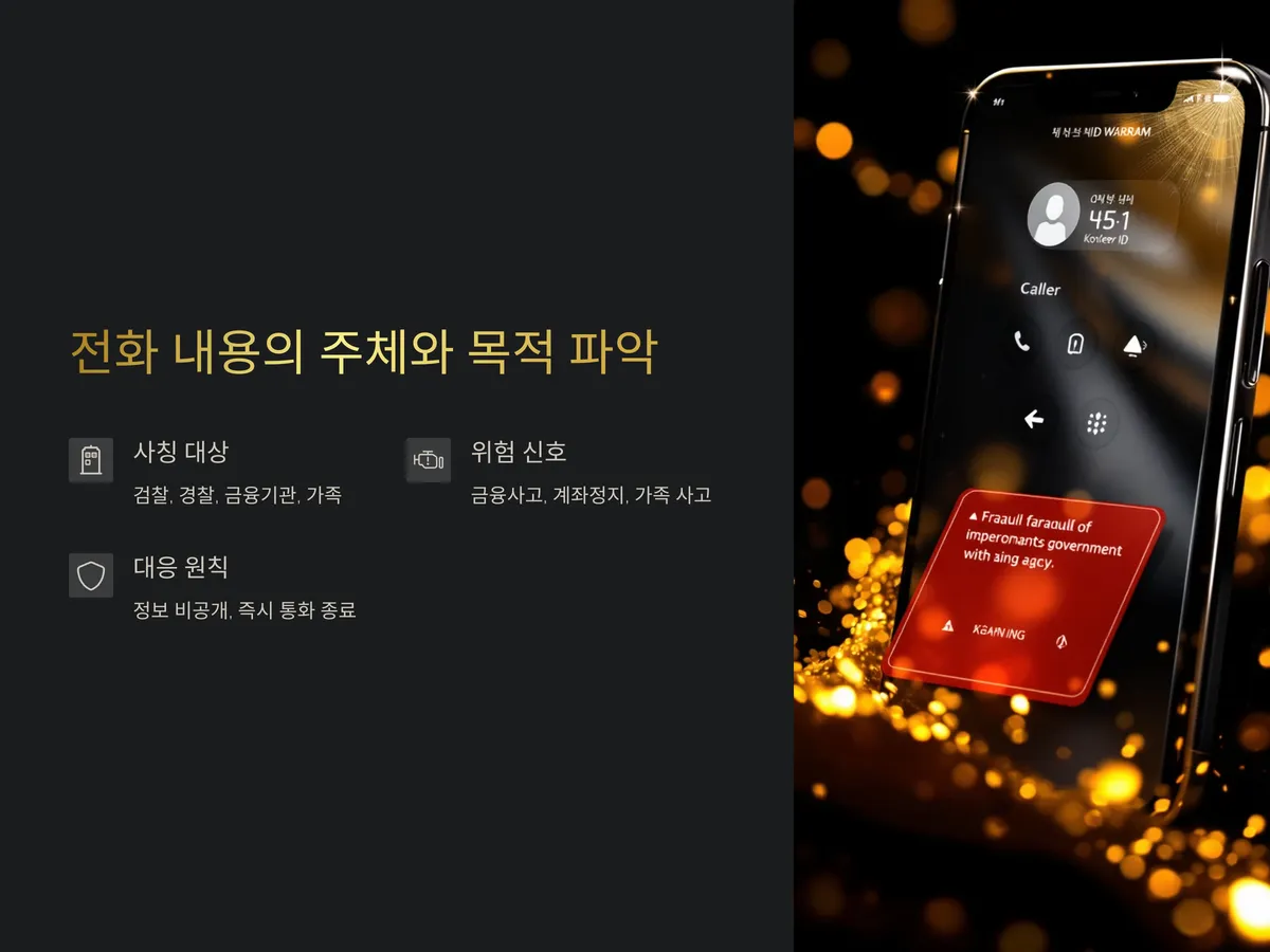 보이스피싱의 시작은 대부분 의심스러운 전화 한 통입니다. 이때 가장 먼저 해야 할 일은 ‘누가’, ‘왜’ 나에게 전화를 했는지를 명확히 파악하는 것입니다. 일반적으로 사기범은 검찰, 경찰, 금융감독원, 은행, 가족 등을 사칭하며 긴박한 상황을 조성합니다. 예를 들어 “금융사고에 연루되어 계좌가 정지됩니다”, “가족이 사고를 당해 급히 돈이 필요합니다” 등의 멘트가 대표적입니다.