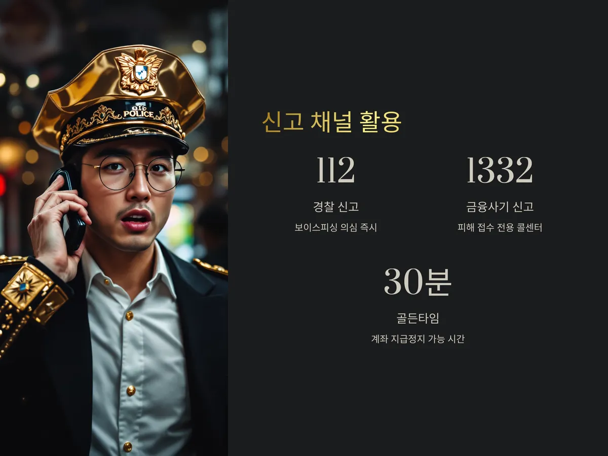 보이스피싱은 혼자 해결하기 어렵기 때문에 반드시 신고가 필요합니다. 전화를 받는 순간 이상하다고 느꼈다면 112에 즉시 신고하거나, 금융사기 피해 접수 전용 콜센터 1332에 연락하세요. 또한 해당 금융기관 고객센터로도 바로 연락해 피해를 줄일 수 있습니다.