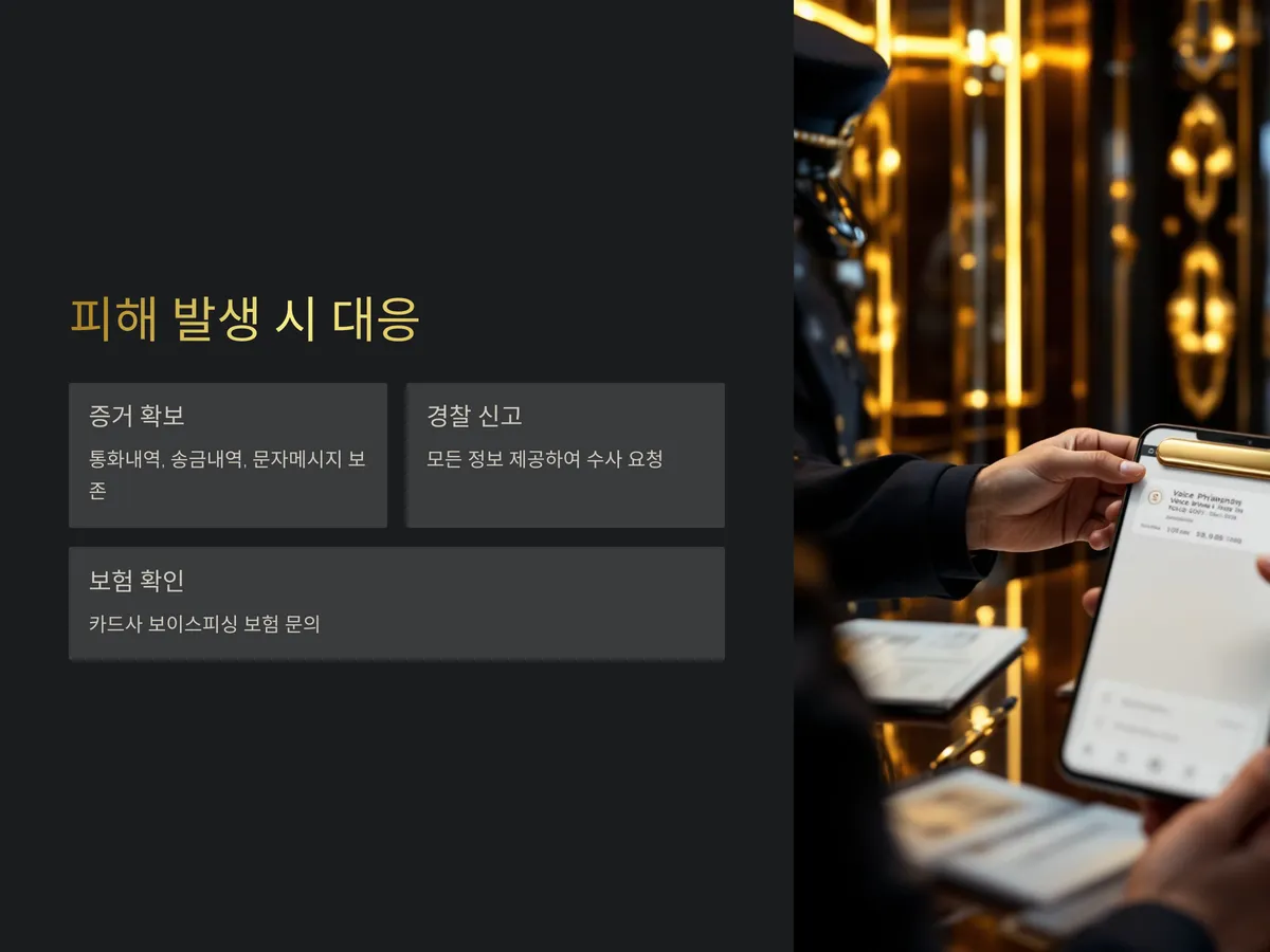만약 보이스피싱으로 인해 실제 송금 등의 피해가 발생했다면, 모든 기록을 보존하고 경찰서에 신고하여 수사를 요청해야 합니다. 이때 중요한 것은 통화내역, 송금내역, 문자메시지, 입금계좌정보 등을 상세히 확보하는 것입니다.