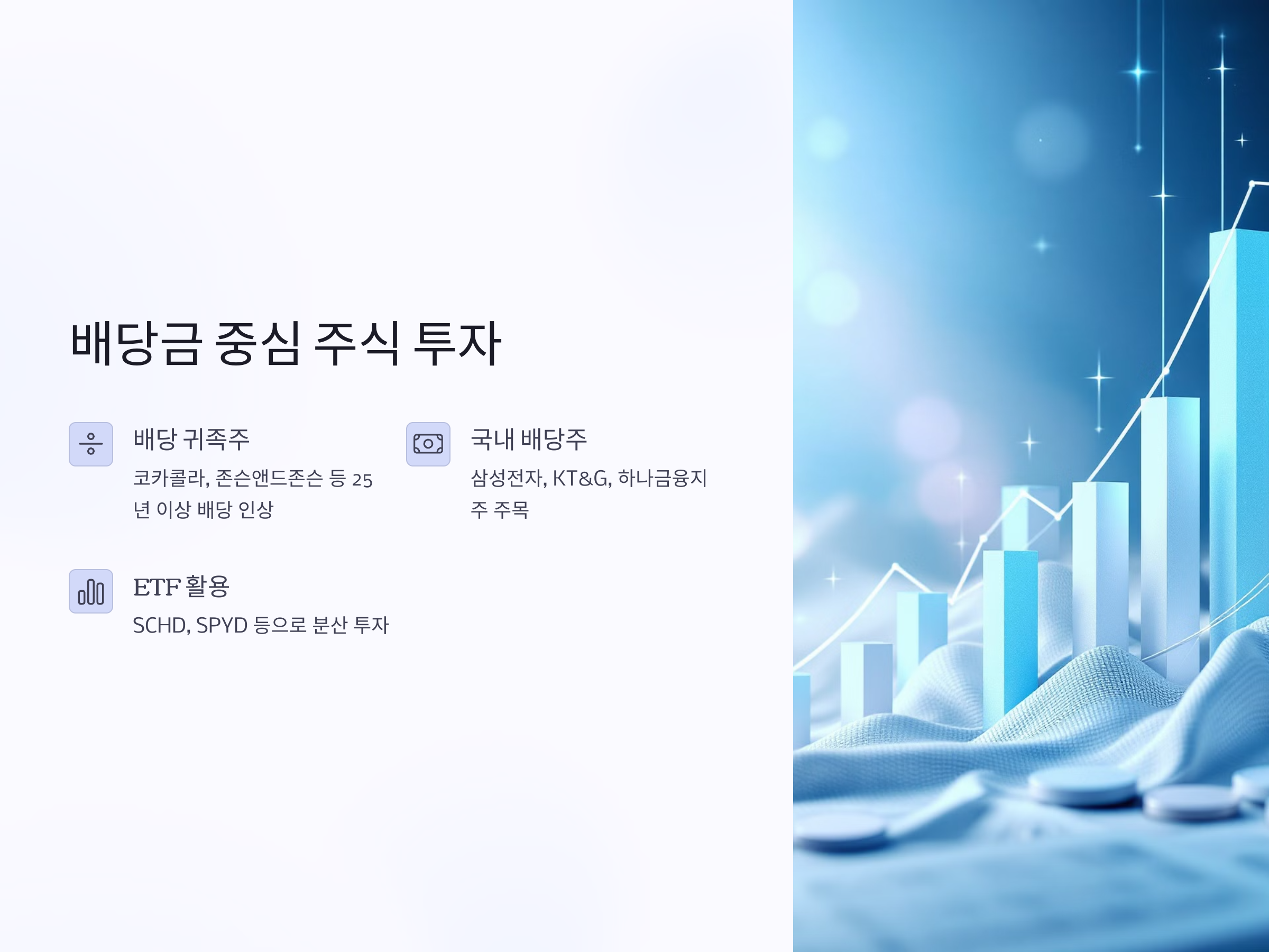 특히 한국에서도 삼성전자, KT&G, 하나금융지주 등의 배당 매력 종목들이 주목받고 있습니다. 2025년부터는 배당소득세 이슈와 맞물려 배당 투자에 대한 절세 전략도 관심을 끌고 있으며, ETF(예: SCHD, SPYD 등) 활용을 통한 분산 투자도 추천됩니다.