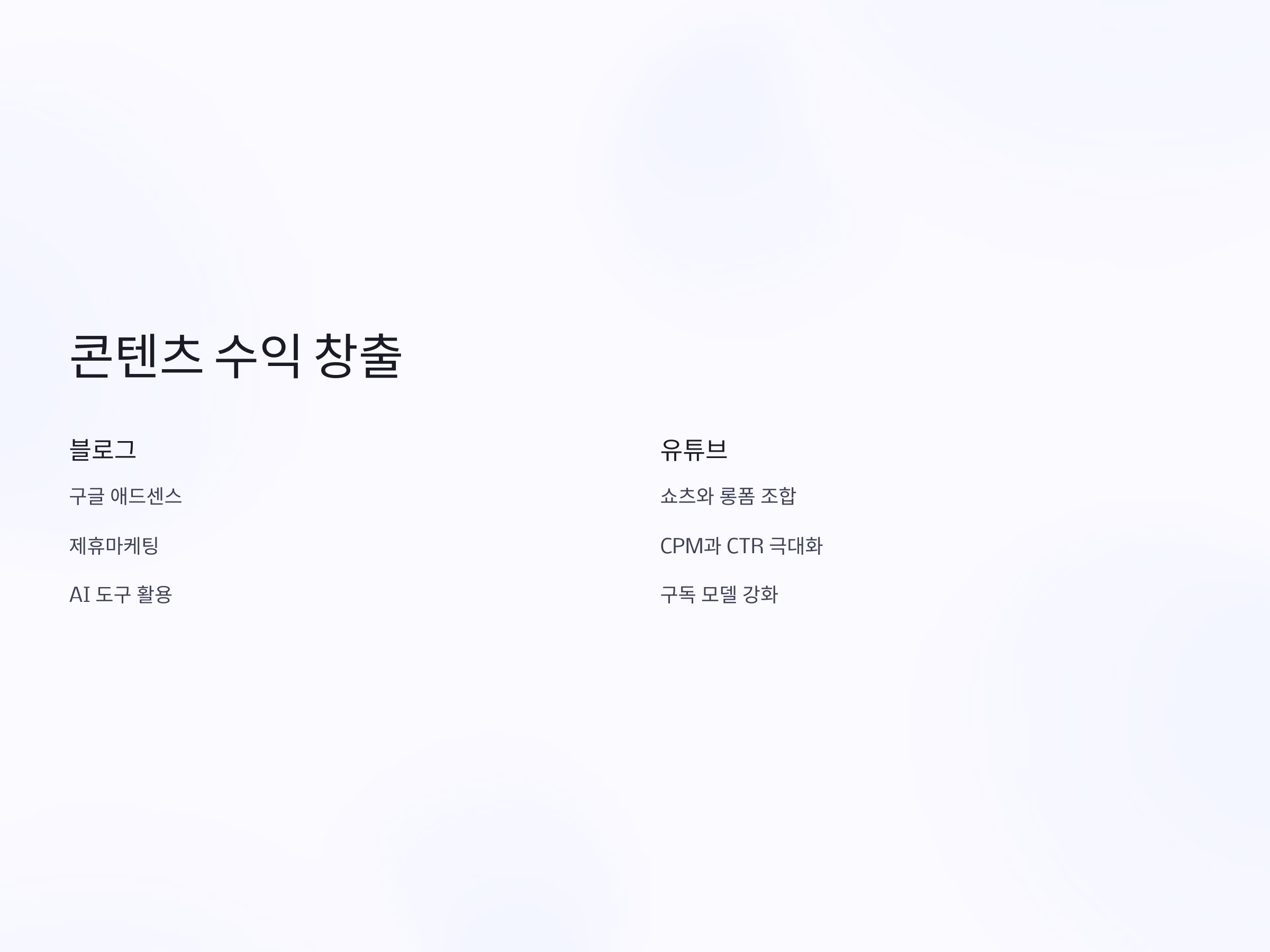 콘텐츠 기반 수익 모델은 적은 초기 자본으로 시작할 수 있고, 시간이 지날수록 복리처럼 누적되는 수익 구조를 가집니다. 대표적으로 블로그와 유튜브는 많은 개인이 실질적인 수익을 창출하고 있는 플랫폼입니다. 특히 블로그는 구글 애드센스를 통한 클릭 수익, 제휴마케팅을 통한 수익 다각화가 가능하며, 최근에는 AI 도구를 활용해 효율적으로 콘텐츠를 제작하는 흐름이 확산되고 있습니다.