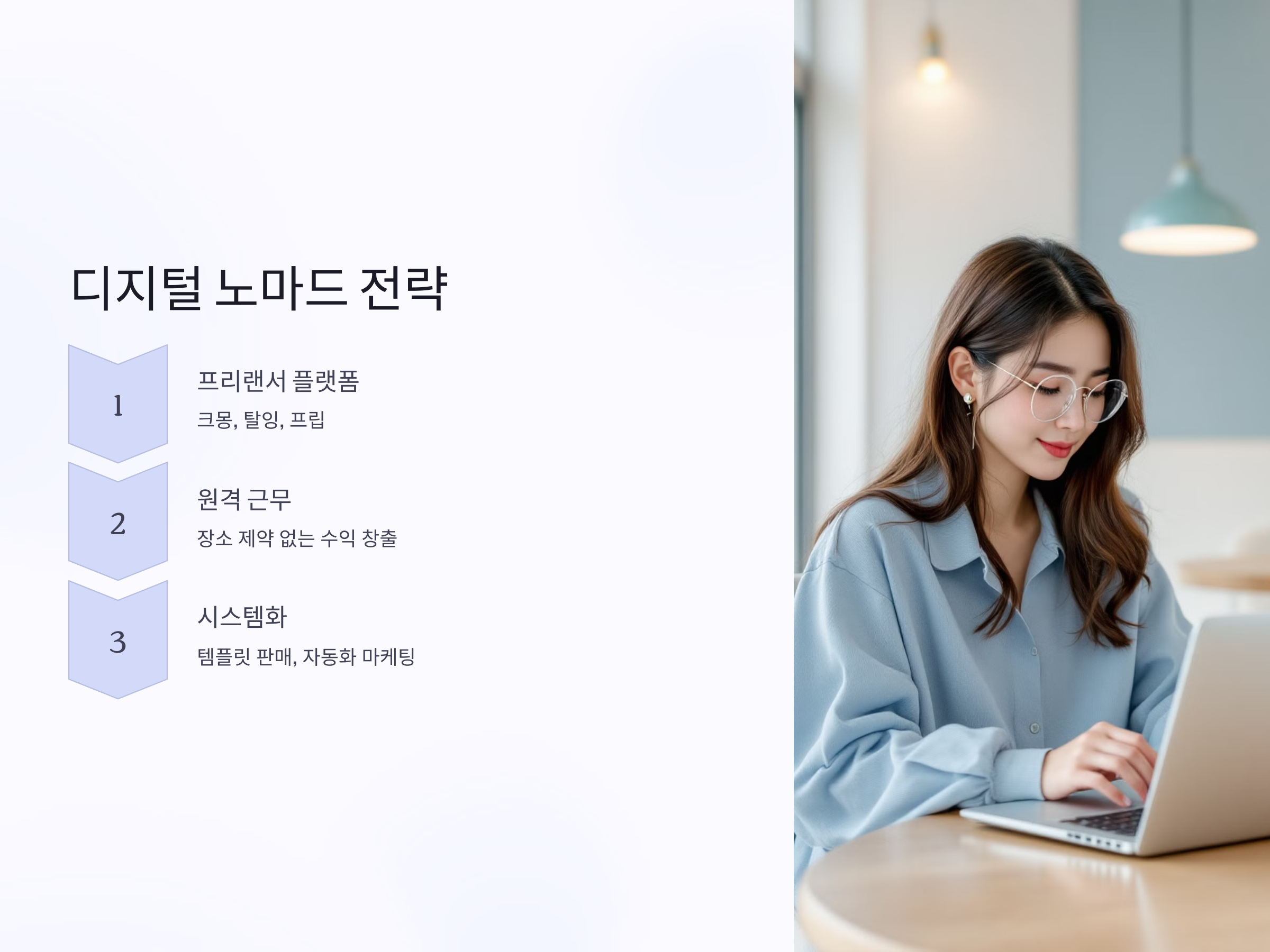 장소에 구애받지 않고 수익을 창출하는 '디지털 노마드' 전략은 코로나19 이후 급부상한 트렌드입니다. 프리랜서 플랫폼(예: 크몽, 탈잉, 프립), 원격근무, 리모트 알바, 에이전시 모델 등을 통해 하나의 수입원이 아닌 다양한 프로젝트 기반 수익을 만들 수 있습니다.