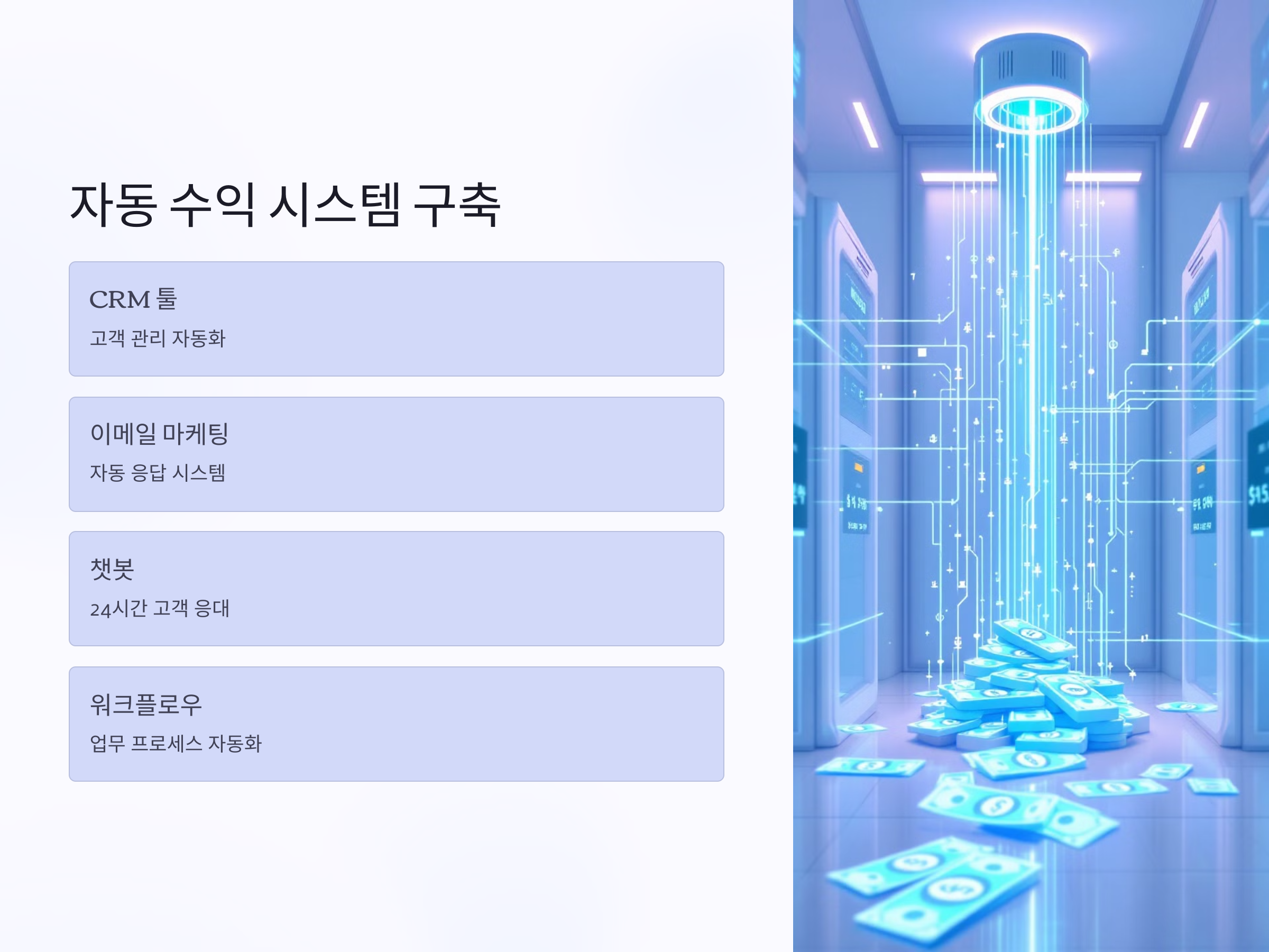 마지막 단계는 수익 모델을 넘어서 '자동화 시스템'을 구축하는 것입니다. CRM 툴, 이메일 마케팅 자동화, 챗봇, 워크플로우 자동화 도구 등을 활용하여 일일이 관리하지 않아도 수익이 발생하는 구조를 만드는 것이 핵심입니다.