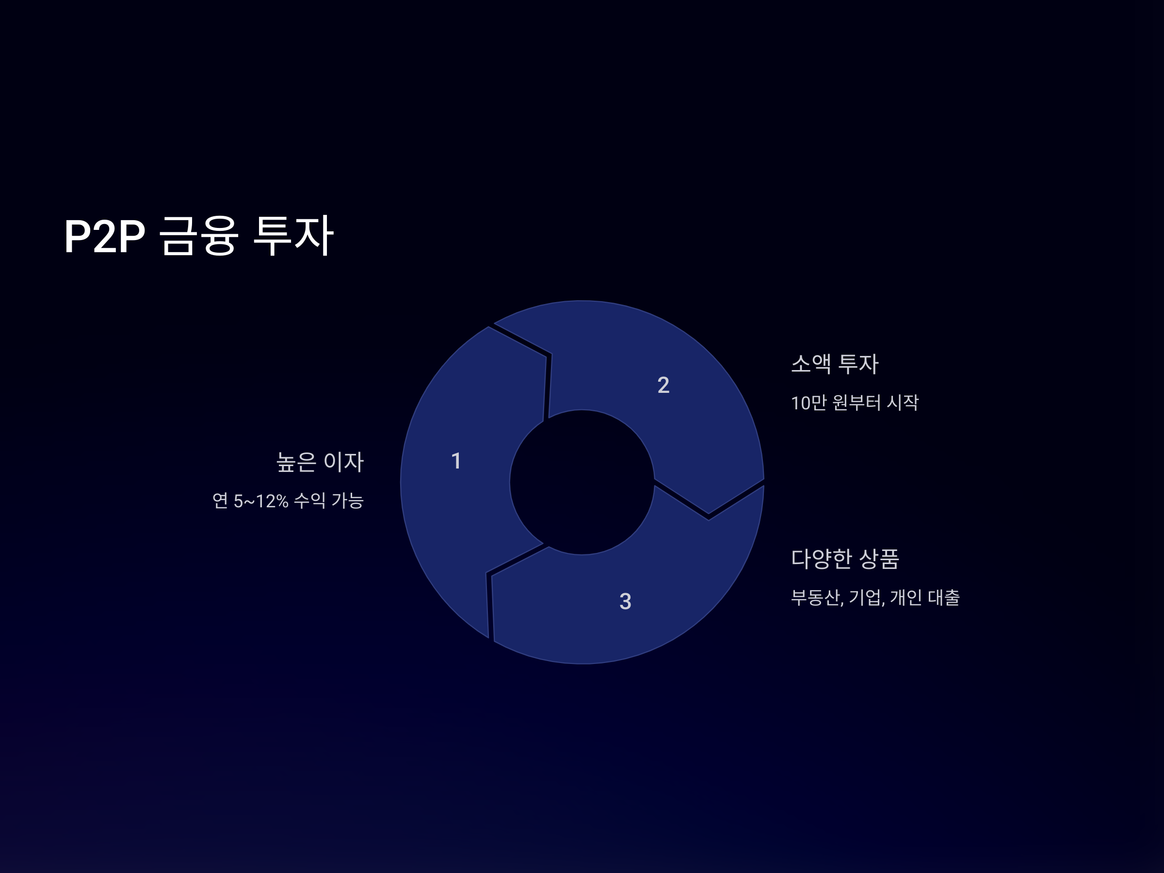 P2P(개인 간 대출) 금융은 투자자가 대출자에게 직접 돈을 빌려주고, 이자로 수익을 얻는 방식입니다. 은행 예금보다 높은 금리를 제공하며, 일정 기간 동안 정기적인 수익을 받을 수 있습니다.