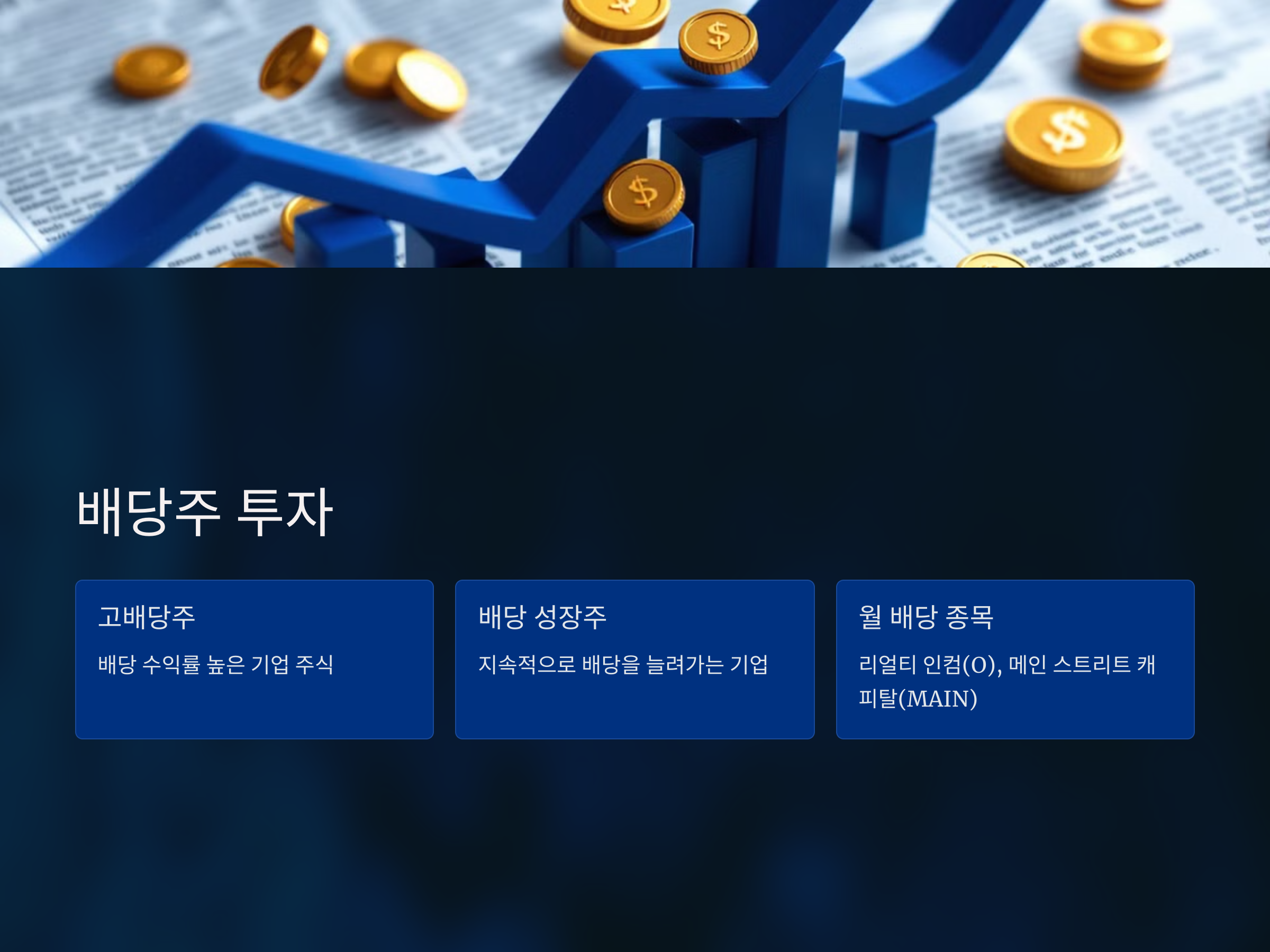 배당주는 주식을 보유하고 있는 것만으로도 일정 기간마다 수익을 받을 수 있는 투자 방식입니다. 배당금을 주는 기업들은 보통 안정적인 수익 구조를 갖고 있으며, 장기적으로 주식 가치 상승과 배당금 증가까지 기대할 수 있습니다.