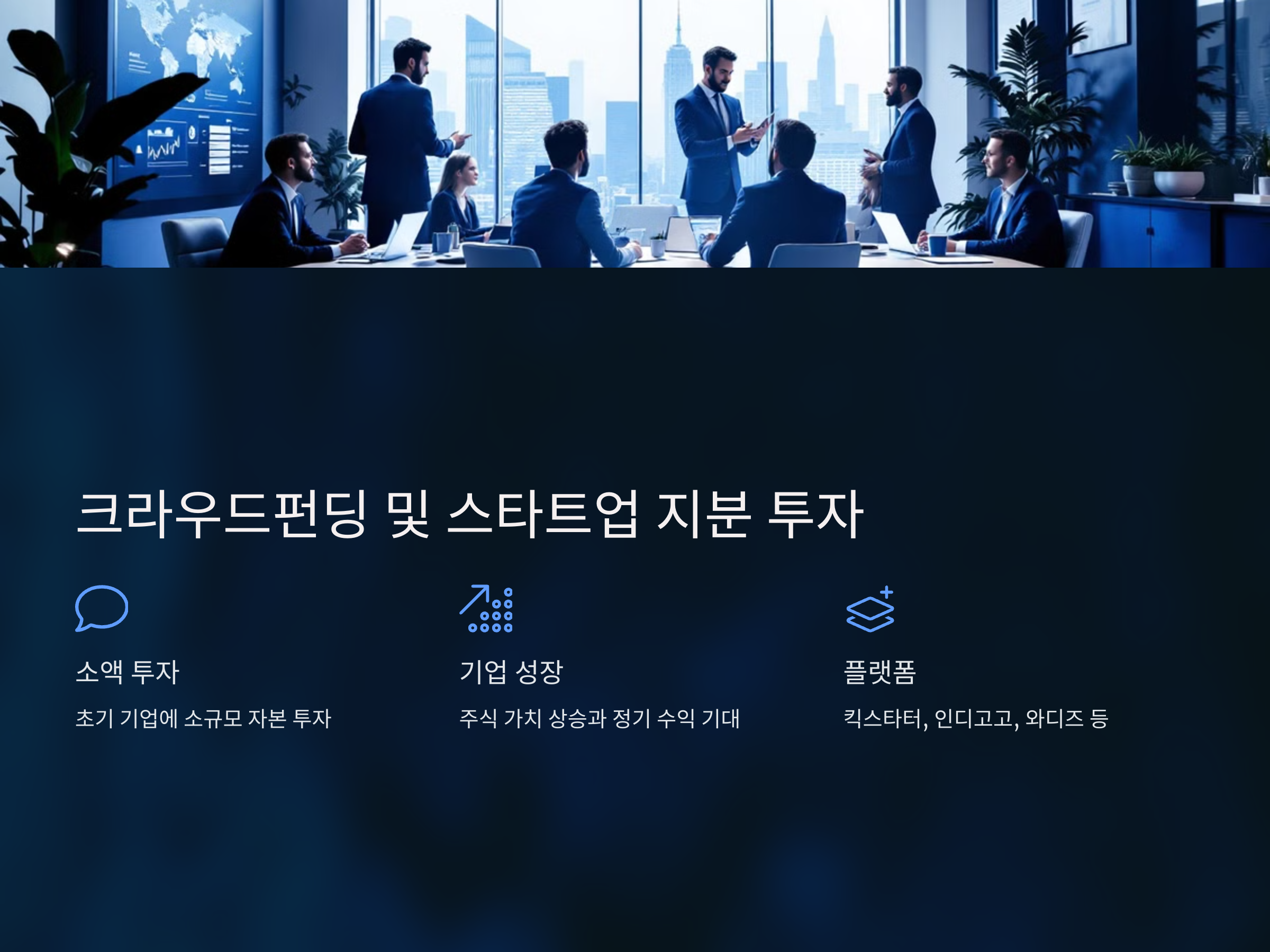 스타트업 크라우드펀딩 플랫폼에서는 초기 기업에 소액으로 투자할 수 있으며, 기업이 성장할 경우 주식 가치 상승과 함께 정기적인 수익을 받을 수도 있습니다. 대표적인 크라우드펀딩 플랫폼으로는 킥스타터(Kickstarter), 인디고고(Indiegogo), 국내에서는 와디즈(Wadiz) 등이 있습니다.