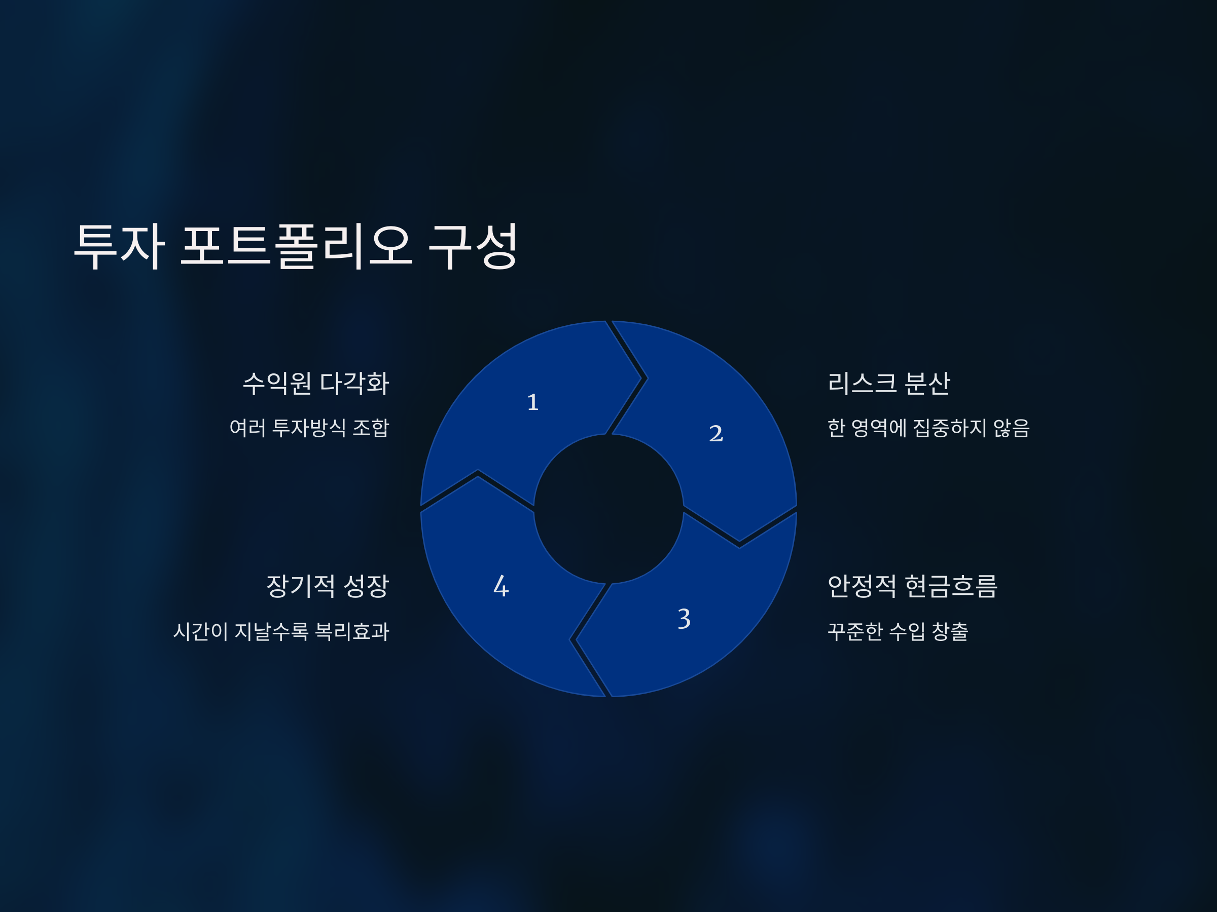 꾸준한 현금 흐름을 원한다면, 한 가지 방법에 집중하기보다는 여러 가지 수익원을 결합하여 포트폴리오를 구성하는 것이 리스크를 줄이고 장기적으로 안정적인 수익을 확보하는 전략이 될 수 있습니다.