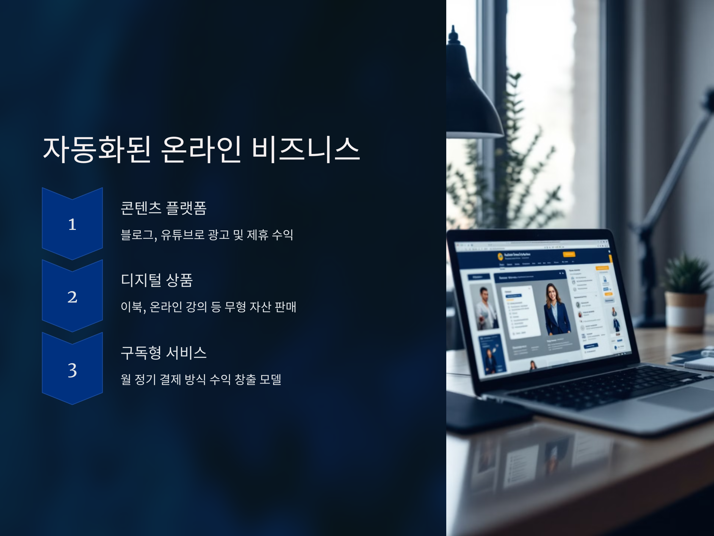 - 이북 및 온라인 강의 판매: 한 번 만들어 놓으면 지속적으로 수익을 발생시키는 무형 자산입니다.