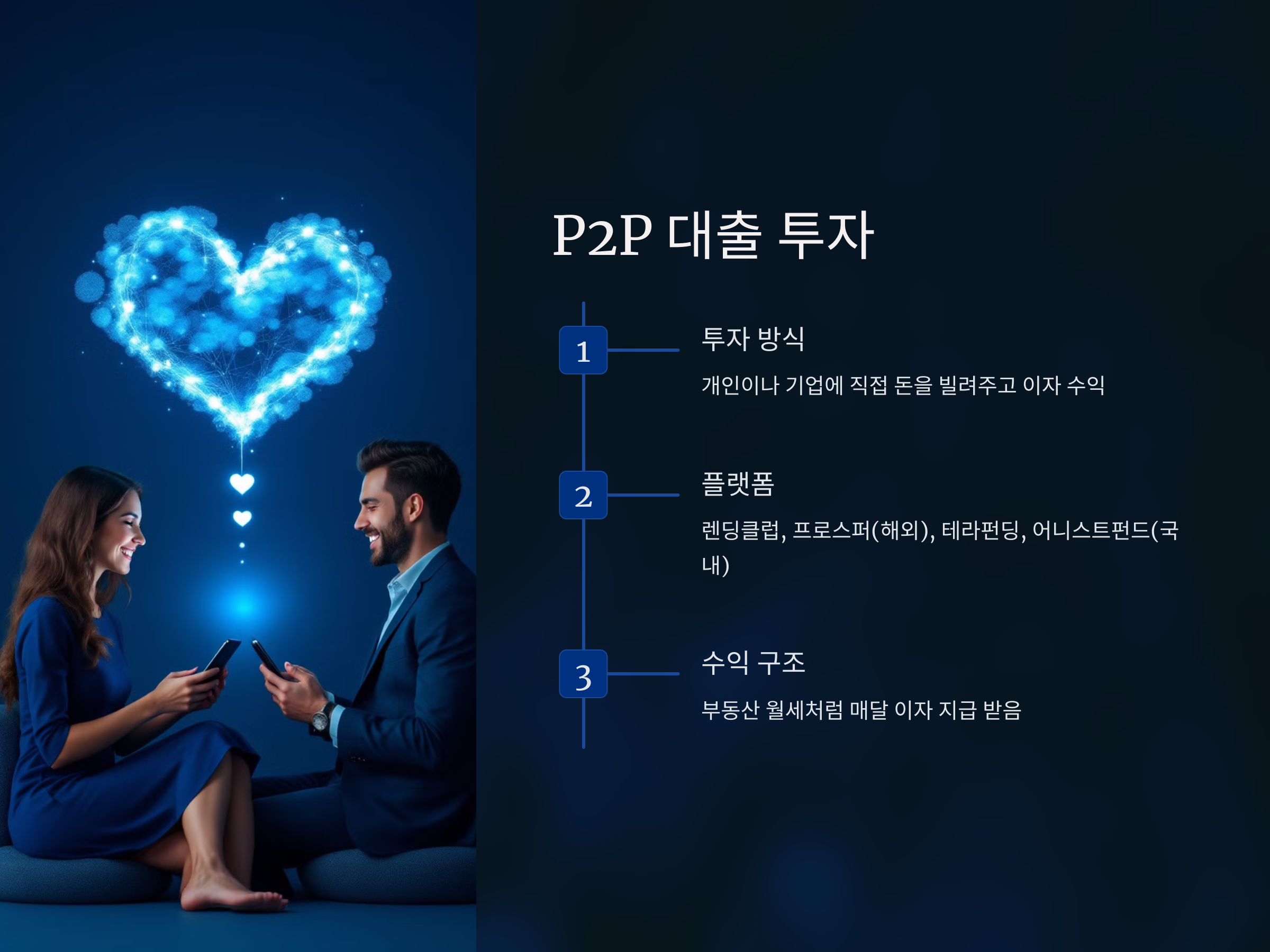 P2P 대출(개인 간 대출)은 투자자가 대출을 원하는 개인이나 기업에 직접 돈을 빌려주고, 이에 대한 이자를 받는 방식입니다.