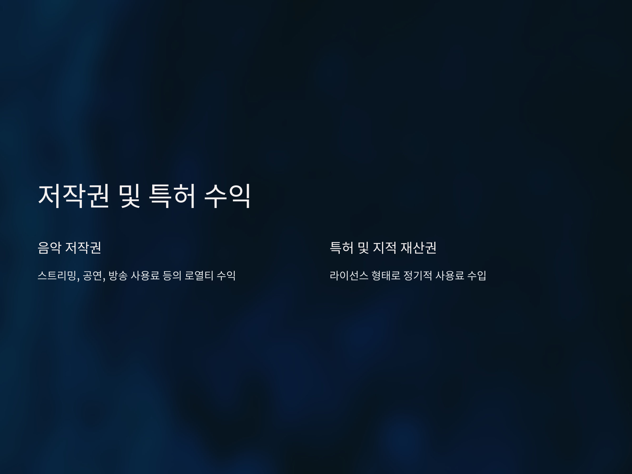 - 음악 저작권 투자: 음악 저작권을 매입하여 스트리밍, 공연, 방송 사용료 등의 로열티 수익을 받을 수 있습니다. 예를 들어, 로열티 익스체인지(Royalty Exchange) 같은 플랫폼을 통해 저작권을 사고팔 수 있습니다.