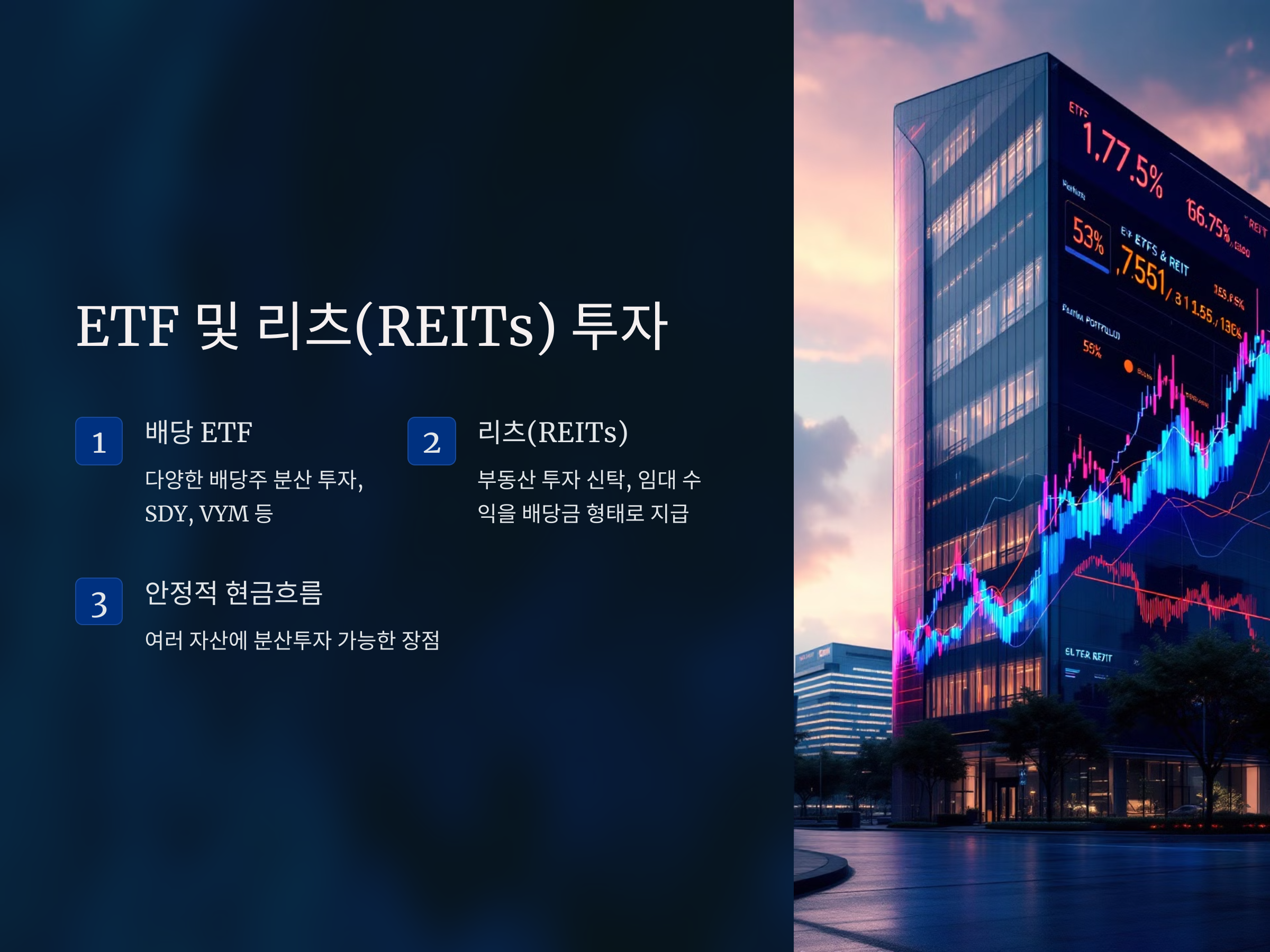 ETF와 리츠는 배당주보다도 더 안정적인 현금 흐름을 제공하며, 여러 자산에 분산 투자할 수 있다는 장점이 있습니다.