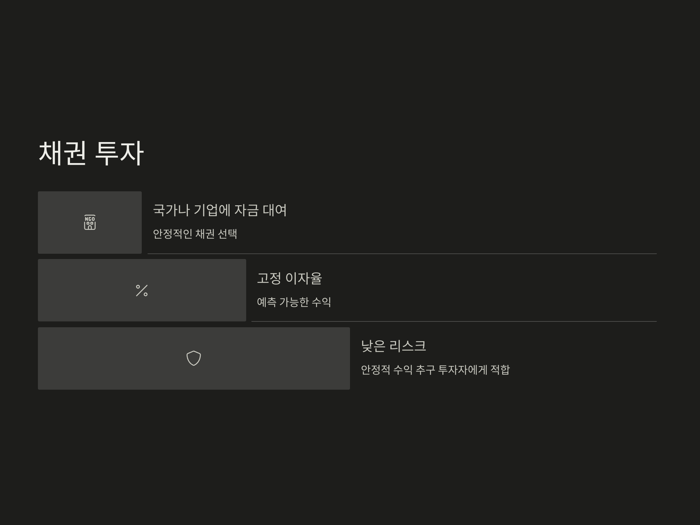 채권은 투자자가 국가나 기업에 돈을 빌려주는 형태로, 일정 기간 동안 고정적인 이자를 지급받는 방식입니다. 채권 투자 역시 월세와 비슷한 형태의 수익을 기대할 수 있습니다. 국채나 기업 채권 등 안정적인 채권을 선택하면 비교적 낮은 리스크로 안정적인 수익을 얻을 수 있습니다.