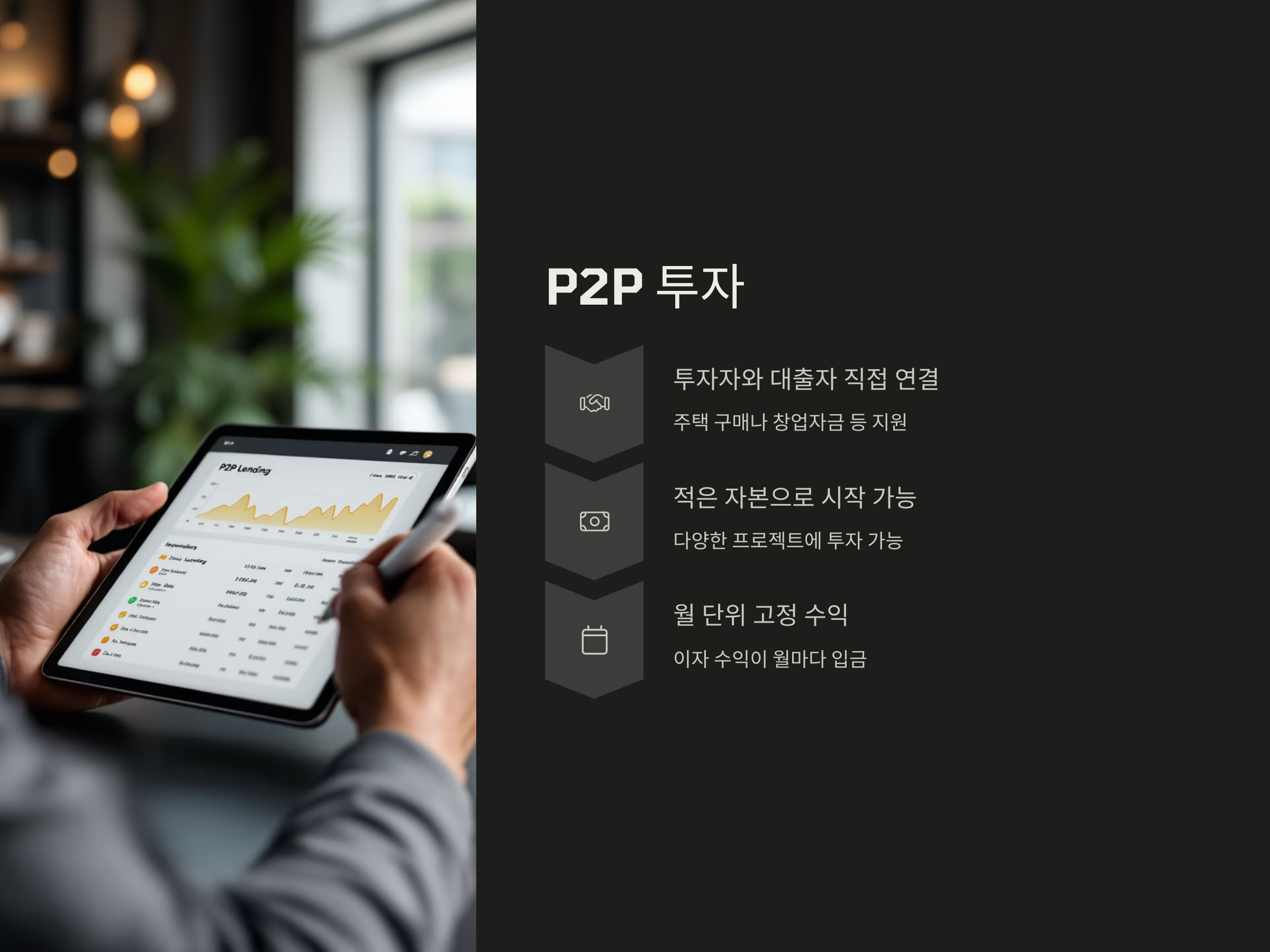 P2P(Peer to Peer) 투자란, 투자자가 대출자를 직접 지원하는 형태의 투자 방식입니다. 대출자는 주택 구매나 창업자금 등을 위해 자금을 빌리며, 투자자는 그 대출금에 대한 이자를 월세처럼 받을 수 있습니다. P2P 투자는 비교적 적은 자본으로 시작할 수 있고, 월 단위로 고정적인 수익을 얻을 수 있다는 점에서 큰 매력을 느낄 수 있습니다.