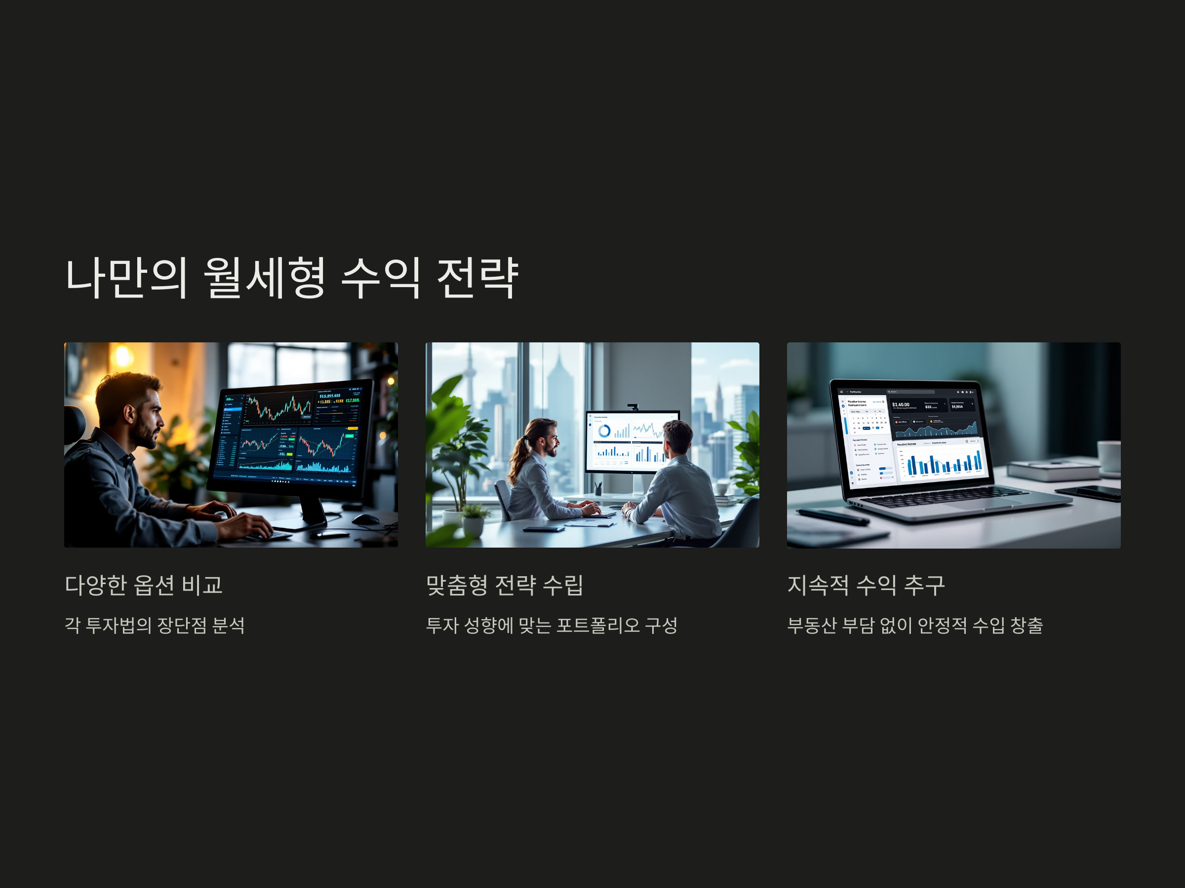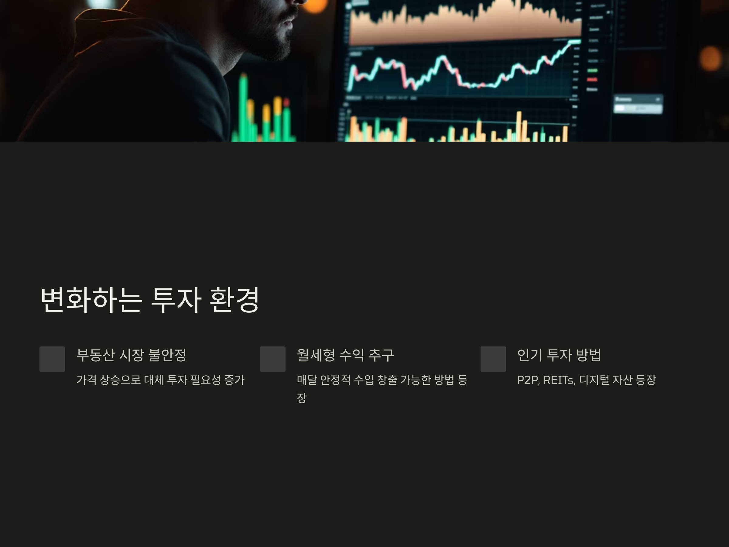 부동산 시장이 불안정하고 가격이 높아지면서, 많은 투자자들이 대체 투자 방법을 모색하고 있습니다. 그 중에서도 월세형 수익을 추구하는 투자자들에게 적합한 투자 방법들이 등장하고 있습니다. 최근 가장 인기 있는 방법으로는 'P2P 투자', 'REITs(부동산투자신탁)', '디지털 자산(예: 크립토 자산)' 등이 있습니다. 이런 투자 방식들은 부동산처럼 매달 수익을 창출할 수 있으면서도, 직접적인 부동산 구매와 관리 없이 투자할 수 있다는 큰 장점이 있습니다.