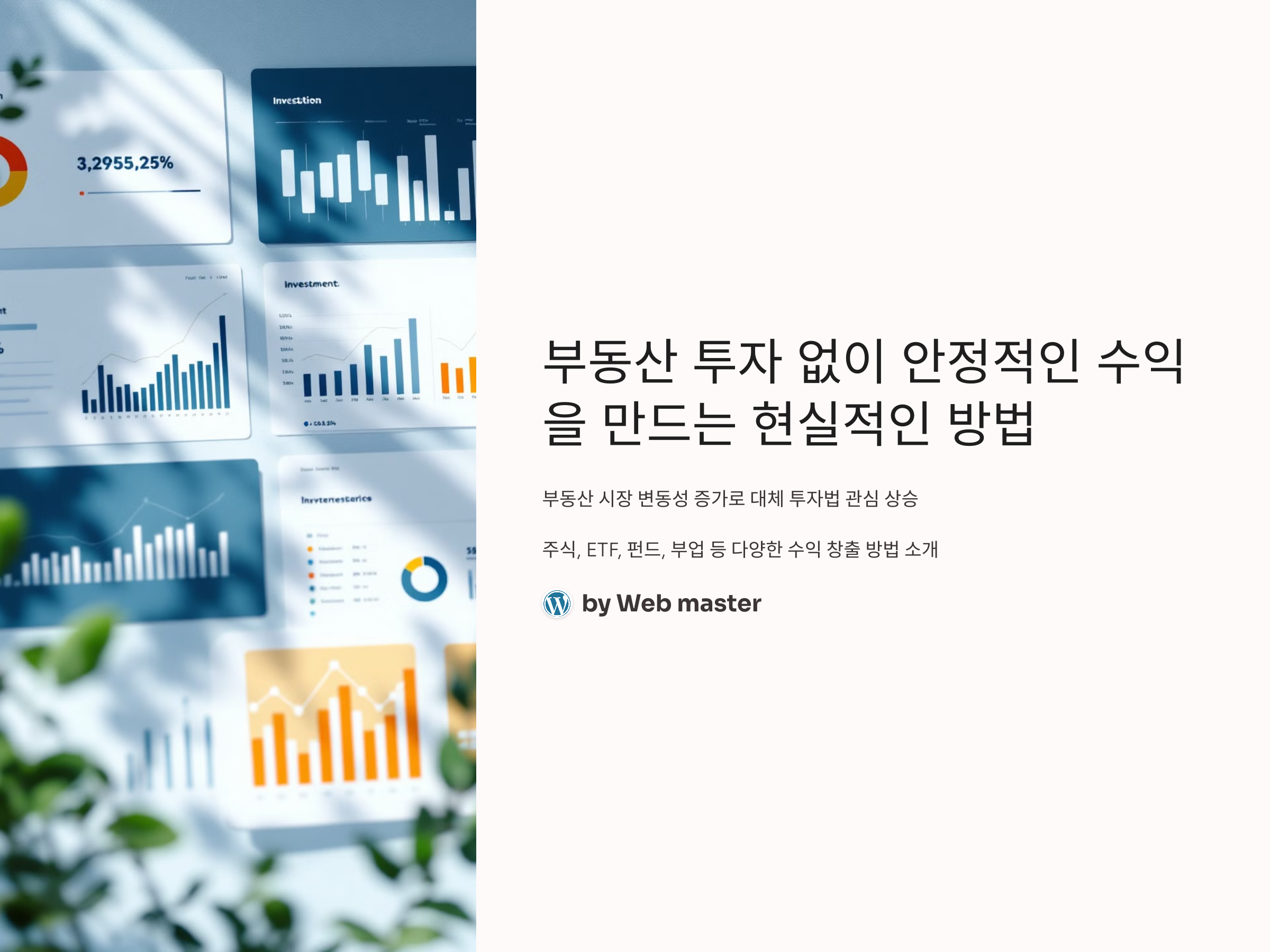 최근 부동산 시장의 변동성이 커지면서, 부동산 투자 없이도 안정적인 수익을 창출하는 방법에 대한 관심이 높아지고 있습니다. 주식, ETF, 펀드 등 다양한 금융 상품과 부업을 통해 추가 수익을 올리는 전략이 주목받고 있습니다. 이번 글에서는 부동산 투자 없이도 안정적인 수익을 만들 수 있는 현실적인 방법들을 소개합니다.