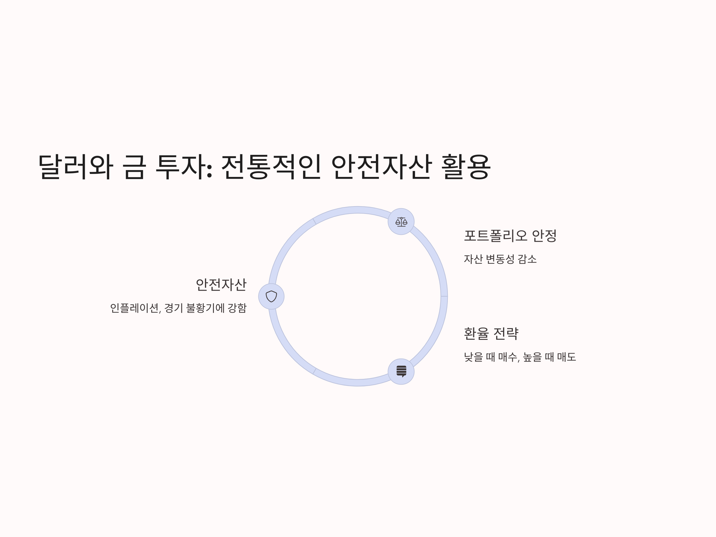 금과 달러는 인플레이션 및 경기 불황기에 강한 전통적인 안전자산입니다. 달러 예금, 금 투자 등을 통해 자산 포트폴리오의 변동성을 낮출 수 있습니다. 환율이 낮을 때 매수하고 높을 때 매도하는 전략을 활용하면 추가적인 수익을 기대할 수 있습니다.
