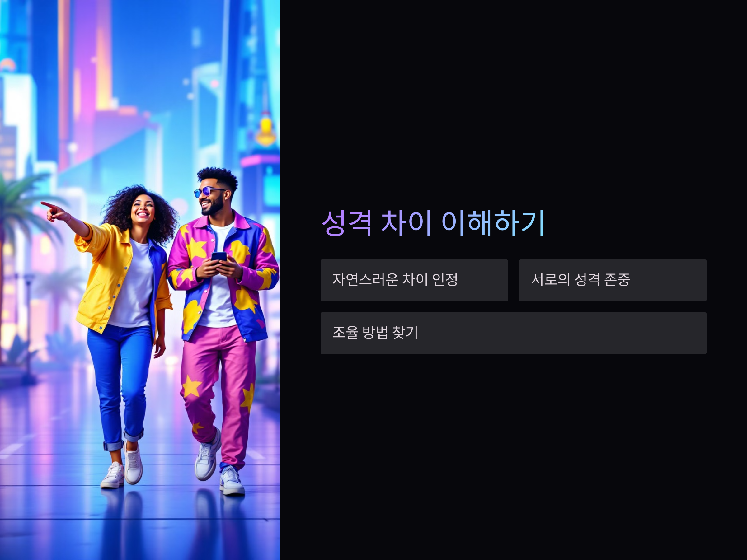 이해와 존중의 마음으로 성격 차이를 받아들이면, 더 많은 갈등을 예방할 수 있습니다. 각자의 성격에 맞는 방법으로 소통하고, 문제가 생길 때는 상대방의 입장을 먼저 이해하려는 노력이 필요합니다.