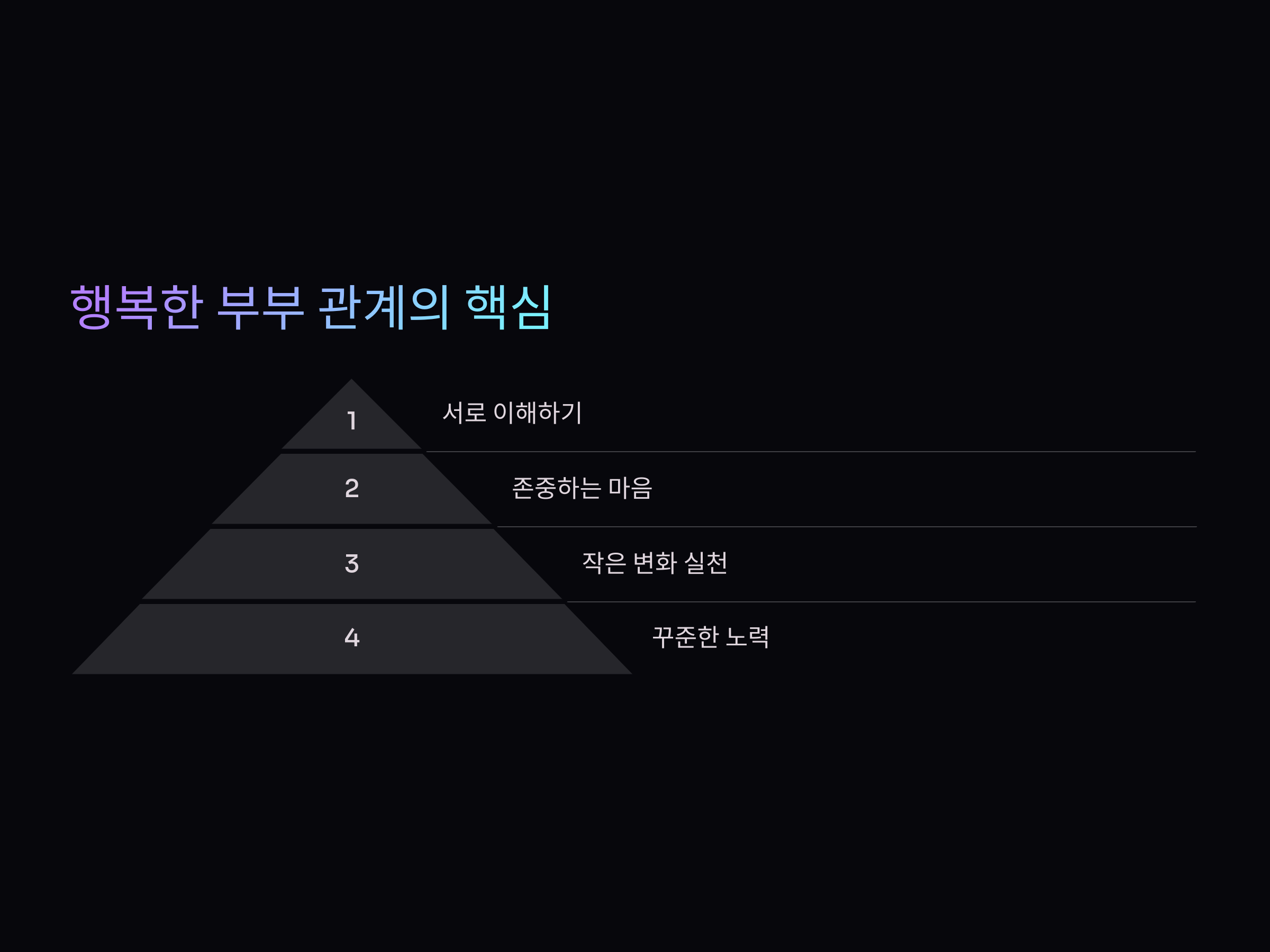 부부 관계는 작은 실천에서부터 시작됩니다. 사랑은 노력과 시간이 필요하지만, 서로를 배려하고 존중하는 마음이 가장 중요합니다. 이 글에서 제시한 실천법을 바탕으로 여러분의 관계가 더 따뜻하고 행복해지길 바랍니다.