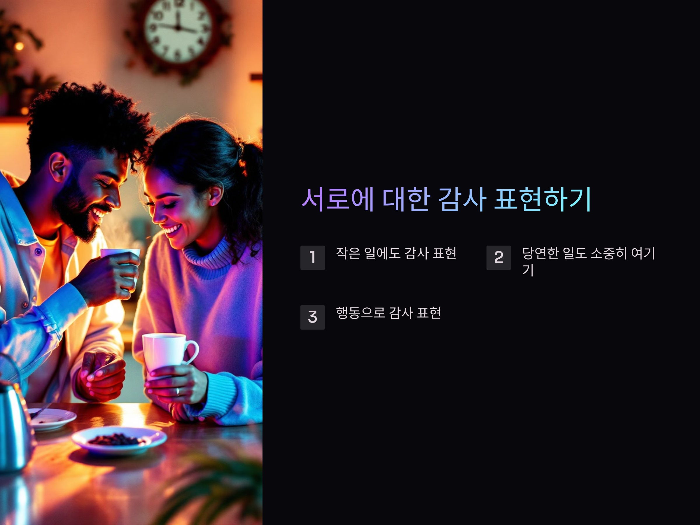 감사는 단지 말뿐만 아니라 행동으로도 표현할 수 있습니다. 예를 들어, 하루 일과가 끝난 후 "고마워, 오늘도 수고했어"라는 한 마디와 함께 간단한 선물을 준비하거나, 상대방이 좋아하는 음식을 만들어 주는 등의 작은 실천이 큰 차이를 만듭니다.