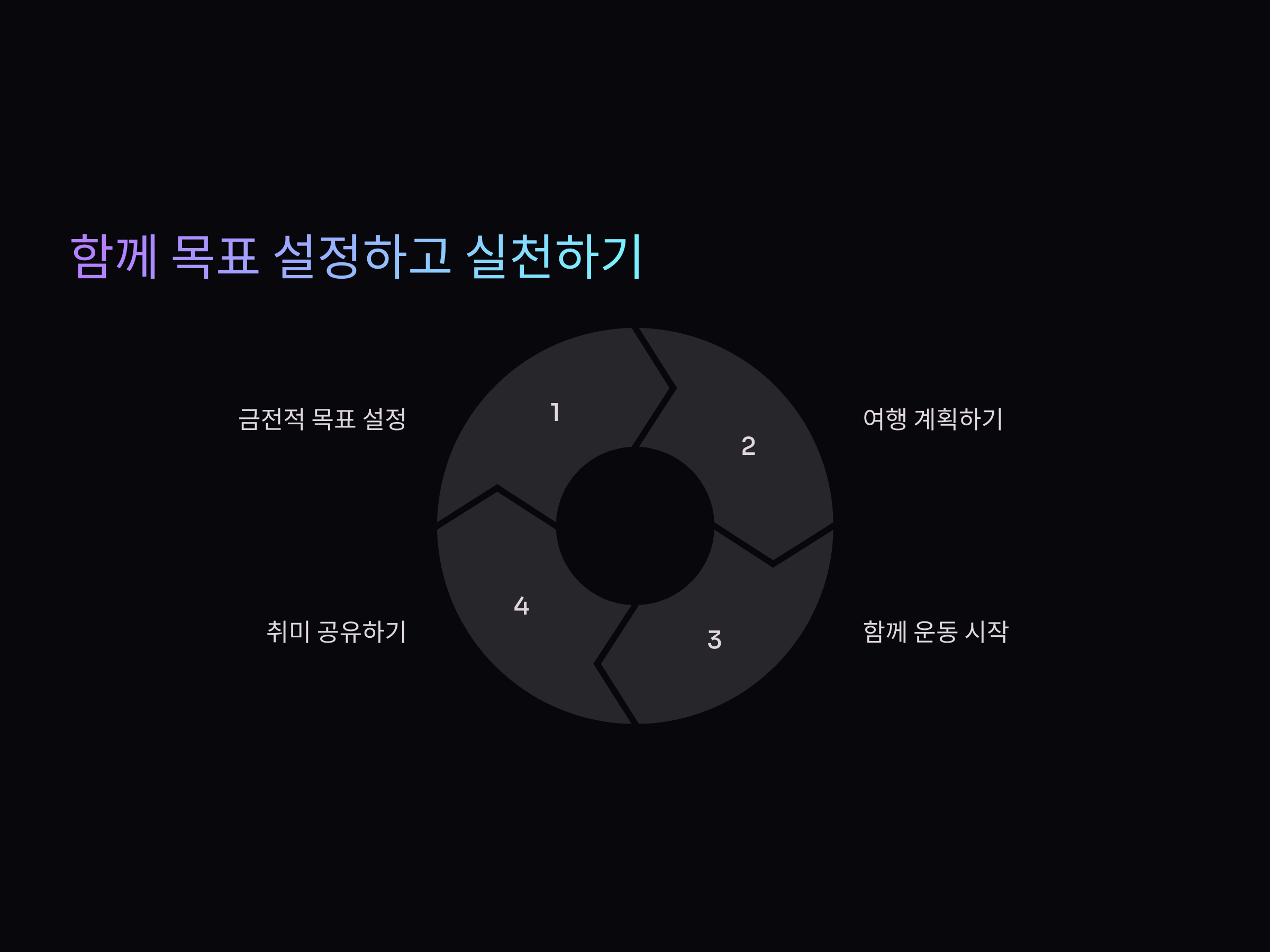 부부가 함께 공동의 목표를 설정하고 이를 함께 실천하는 것은 두 사람 사이의 유대감을 강화하는 좋은 방법입니다. 예를 들어, 금전적 목표를 설정하거나, 여행을 가는 등의 목표를 세우고 그것을 향해 나아가는 과정에서 서로 협력하고 지원하는 경험을 쌓을 수 있습니다. 함께 목표를 이루어 나가는 경험은 서로에 대한 신뢰를 쌓는 데 큰 도움이 됩니다.