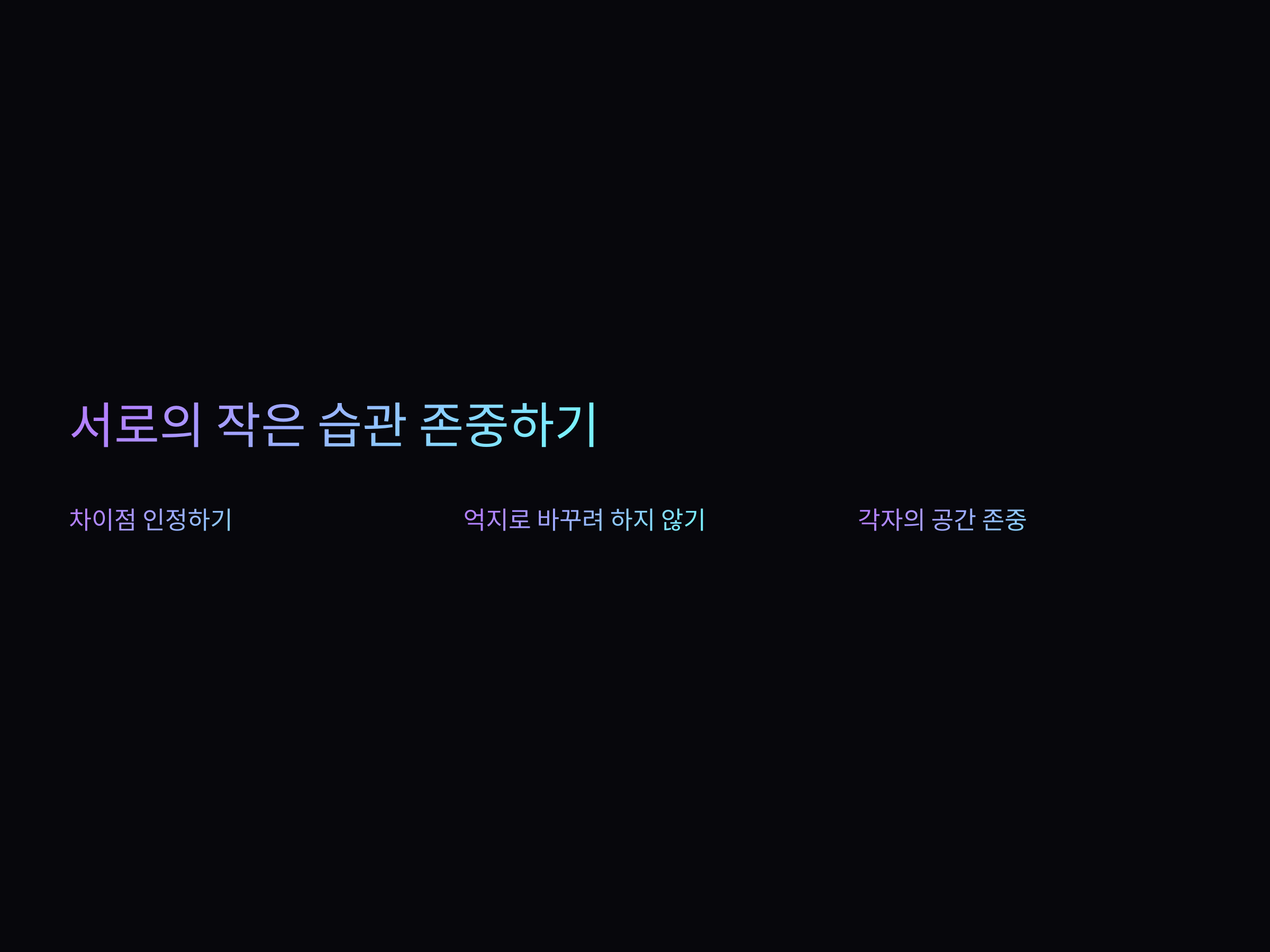 예를 들어, 한 사람이 깔끔한 것을 좋아하고 다른 사람은 조금 더 편안하게 지내는 스타일일 수 있습니다. 이때 서로의 차이를 이해하고, 한쪽의 성향을 억지로 바꾸려 하지 않으며, 각자의 공간을 존중하는 것이 중요합니다. 때때로 서로의 공간을 나누는 것도 큰 도움이 될 수 있습니다.