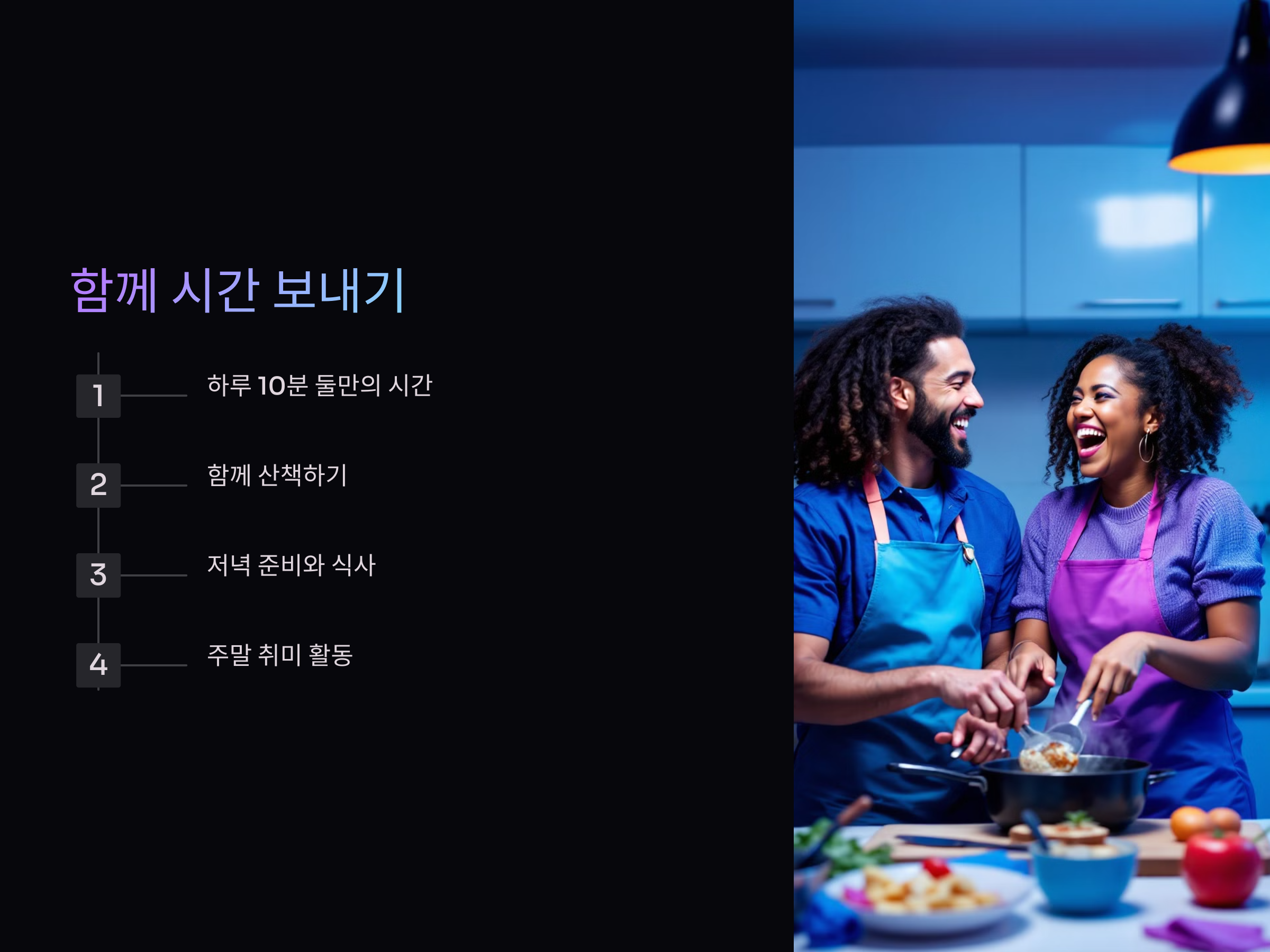 함께 산책을 하거나, 저녁을 함께 준비하고 먹는 것만으로도 두 사람은 자연스럽게 가까워질 수 있습니다. 주말에는 함께 취미 활동을 하거나 영화를 보는 것도 좋은 방법입니다. 이런 활동들이 부부 사이의 대화를 이끌어내고, 서로의 관심사나 감정을 공유하는 기회를 제공합니다.