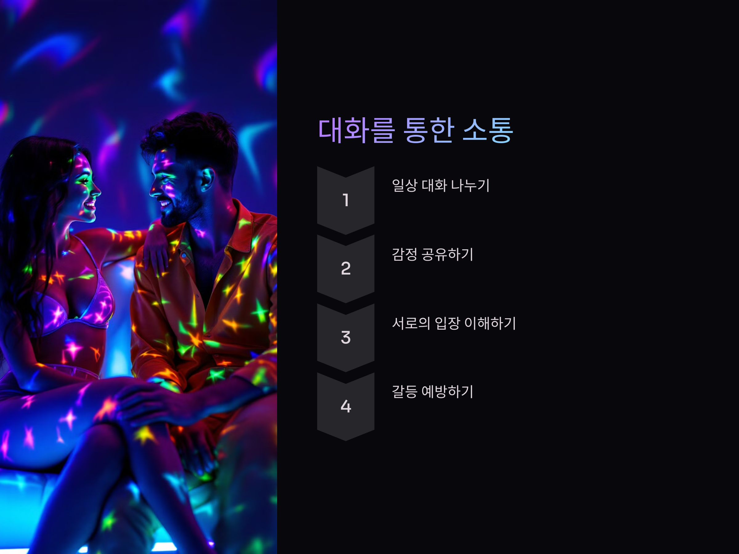 부부가 자주 대화하며 서로의 입장을 이해하고, 감정을 공유할 수 있다면 갈등을 예방할 수 있습니다. 또한, 대화가 잘 이루어지면 서로의 소소한 변화나 기분도 쉽게 알 수 있어, 불필요한 오해를 줄일 수 있습니다.