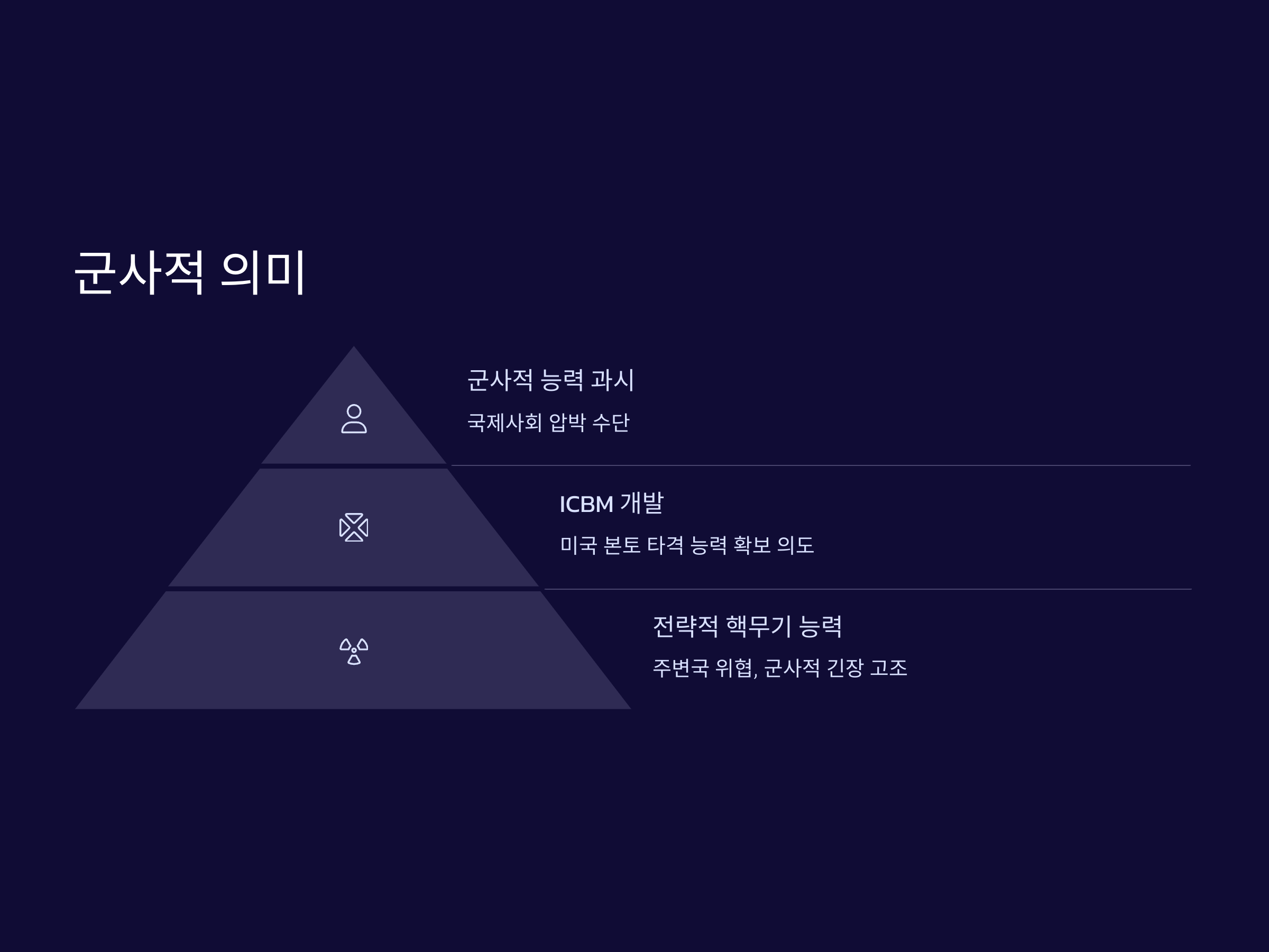북한의 미사일 도발은 단순한 군사적 실험에 그치지 않고, 군사적 전략을 나타내는 중요한 신호로 해석될 수 있습니다. 북한은 다양한 종류의 미사일을 발사하면서 자신들의 군사적 능력을 과시하고 있으며, 이는 국제 사회에 대한 압박 수단으로 사용됩니다. 특히, 북한은 대륙간탄도미사일(ICBM)과 같은 고도화된 미사일을 개발하며, 미국 본토를 타격할 수 있는 능력을 확보하려는 의도를 보이고 있습니다.