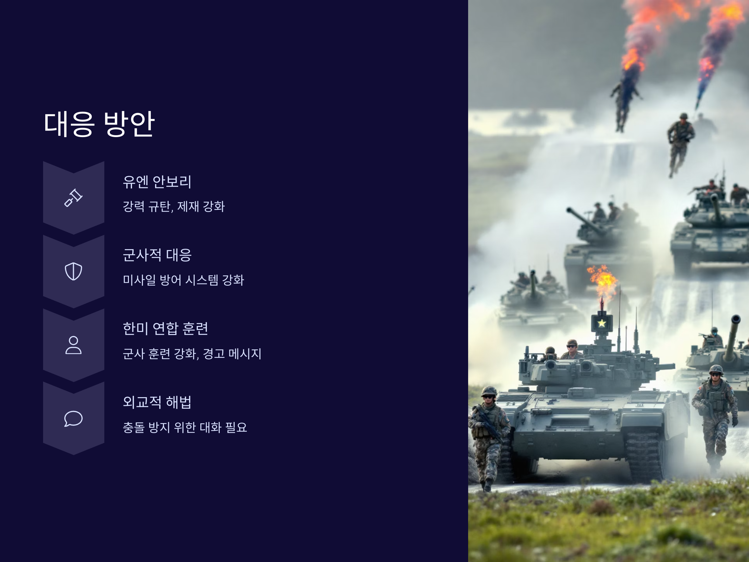 한국과 일본은 북한의 도발에 대해 즉각적인 군사적 대응을 준비하고 있으며, 미사일 방어 시스템을 강화하는 등의 조치를 취하고 있습니다. 또한, 미국은 한미 연합 군사 훈련을 강화하고, 북한의 군사적 도발에 대한 경고 메시지를 전달하고 있습니다. 그러나 군사적 대응은 더욱 큰 충돌을 초래할 수 있기 때문에, 외교적 해법이 함께 추진되어야 한다는 의견도 제기되고 있습니다.