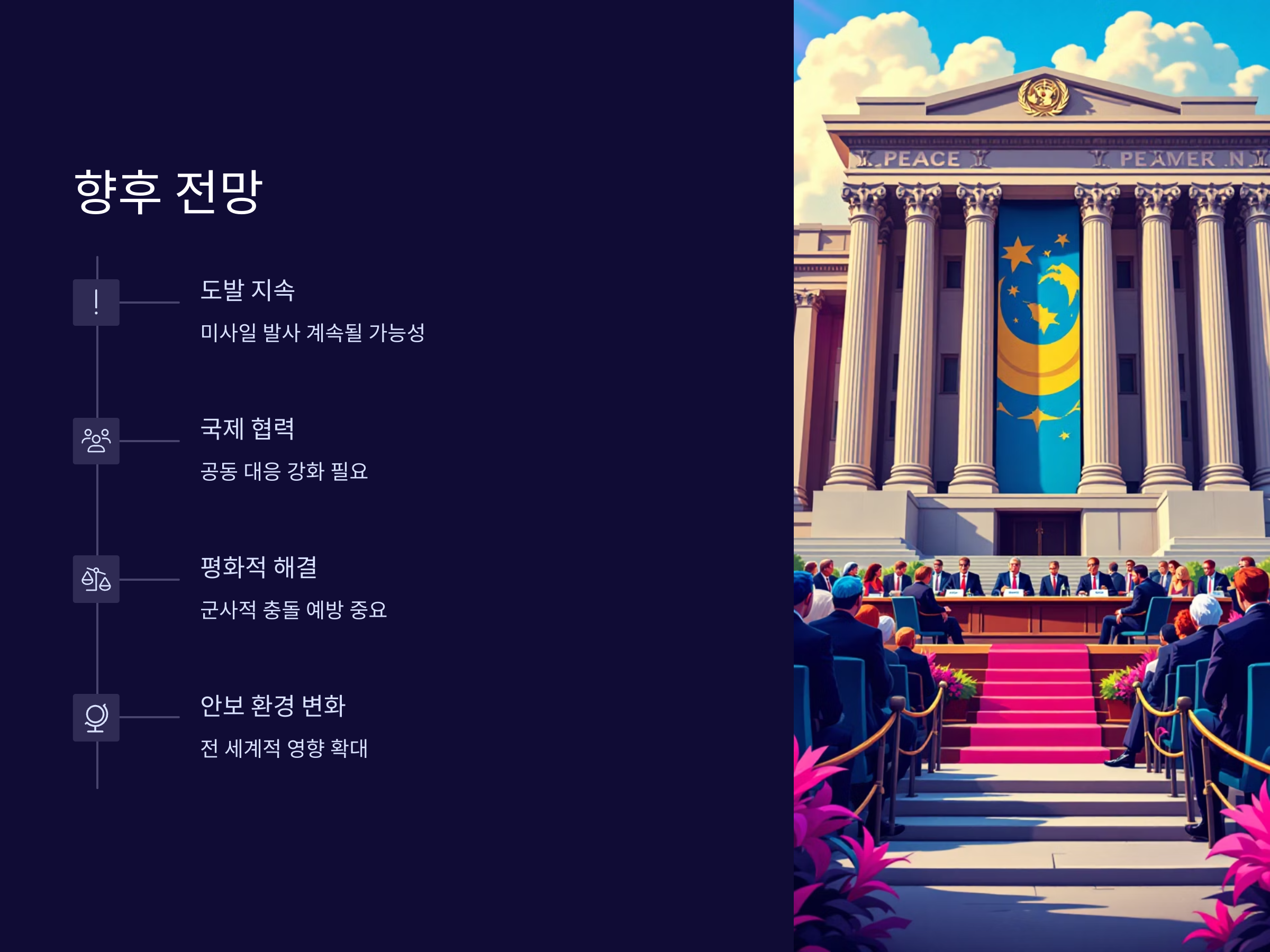 북한의 미사일 도발이 더욱 고도화될 경우, 지역적 불안정은 물론 전 세계적인 안보 환경에도 심각한 영향을 미칠 수 있습니다. 따라서 국제사회는 북한의 군사적 도발을 효과적으로 억제하고, 안정적인 평화를 유지할 수 있는 전략을 지속적으로 개발해야 합니다.