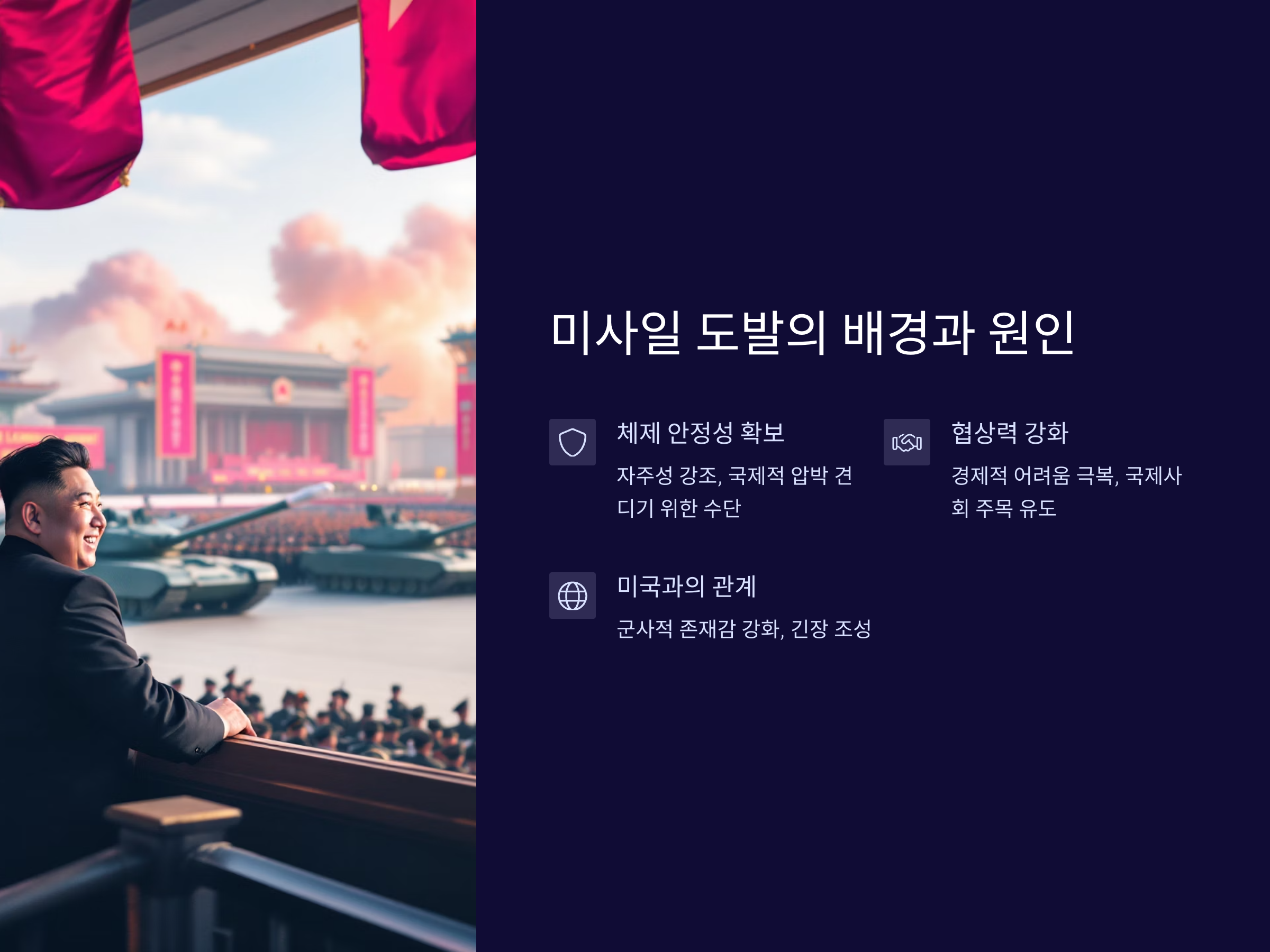 북한의 미사일 발사는 단순히 군사적 목적에만 그치지 않습니다. 북한은 국가의 자주성을 강조하며 국제사회에 자신의 입장을 강하게 주장하고 있습니다. 북한의 핵과 미사일 개발은 내부적으로는 체제의 안정성을 확보하고, 외부적으로는 국제적 압박을 견디기 위한 수단으로 여겨집니다. 특히, 북한은 미국과의 관계에서 끊임없는 긴장을 일으키며, 이를 통해 자신들의 군사적 존재감을 강화하고 있습니다.