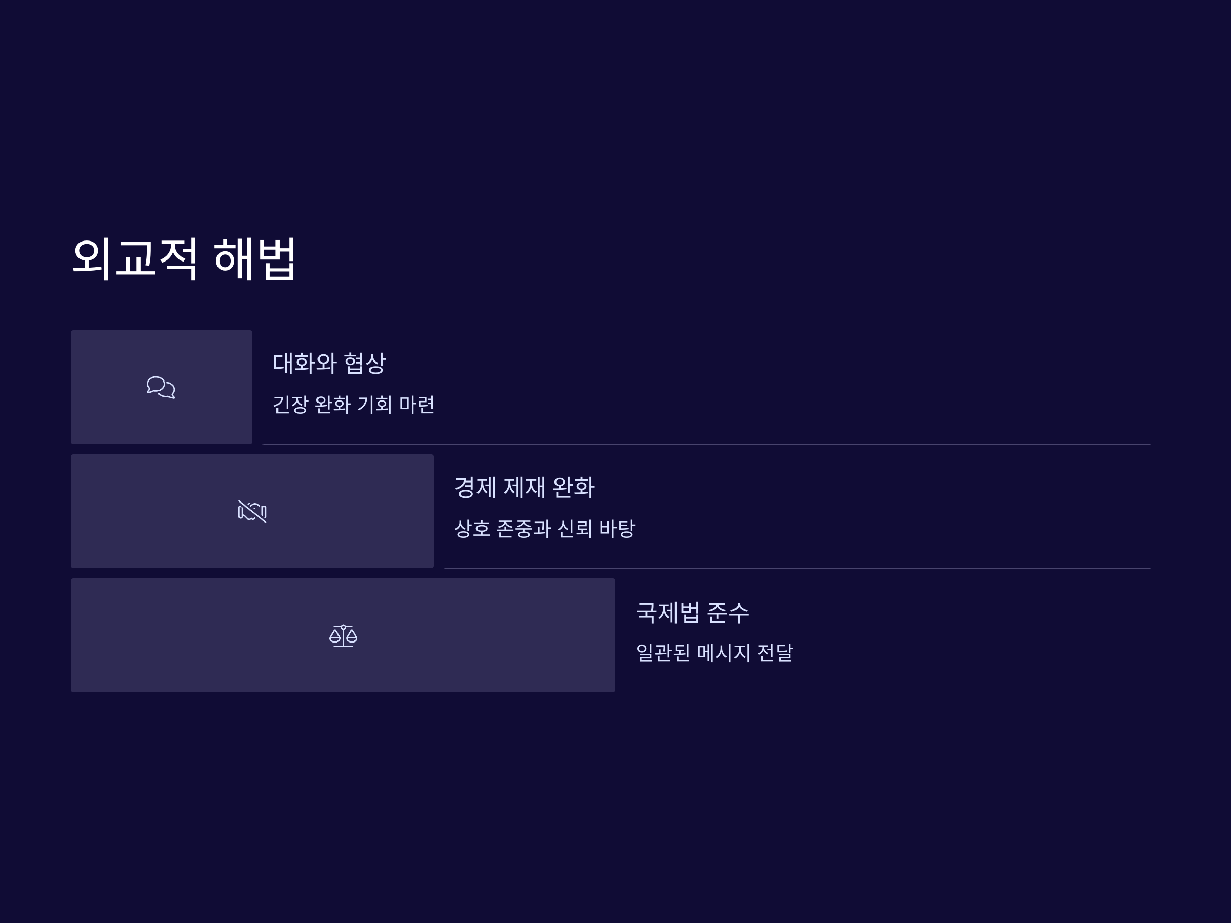 외교적 해법을 통해 북한과의 긴장을 완화하고, 경제 제재를 완화하는 방향으로 나아갈 수 있습니다. 이를 위해 국제사회는 일관된 메시지를 전달해야 하며, 북한도 국제법을 준수하는 방향으로 나아가야 합니다. 외교적 협상의 핵심은 상호 존중과 신뢰를 바탕으로 한 대화입니다.
