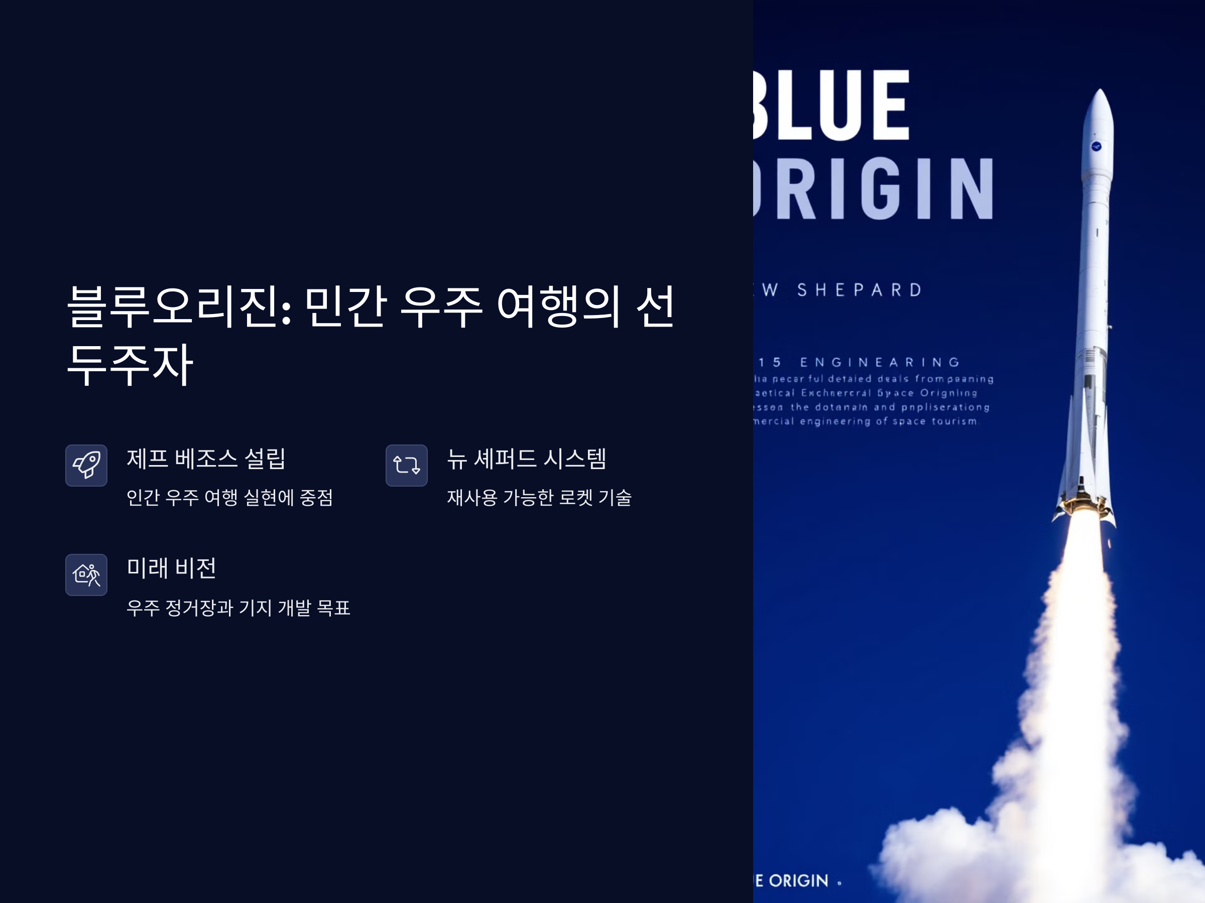 블루오리진은 제프 베조스가 설립한 민간 우주 기업으로, 인간의 우주 여행을 실현하는 데 중점을 두고 있습니다. 블루오리진은 그들의 목표를 '지구를 떠난 후 우주 여행을 일상화하는 것'으로 설정하고 있으며, 이를 위해 신속하고 반복 가능한 발사 시스템을 구축하고 있습니다.