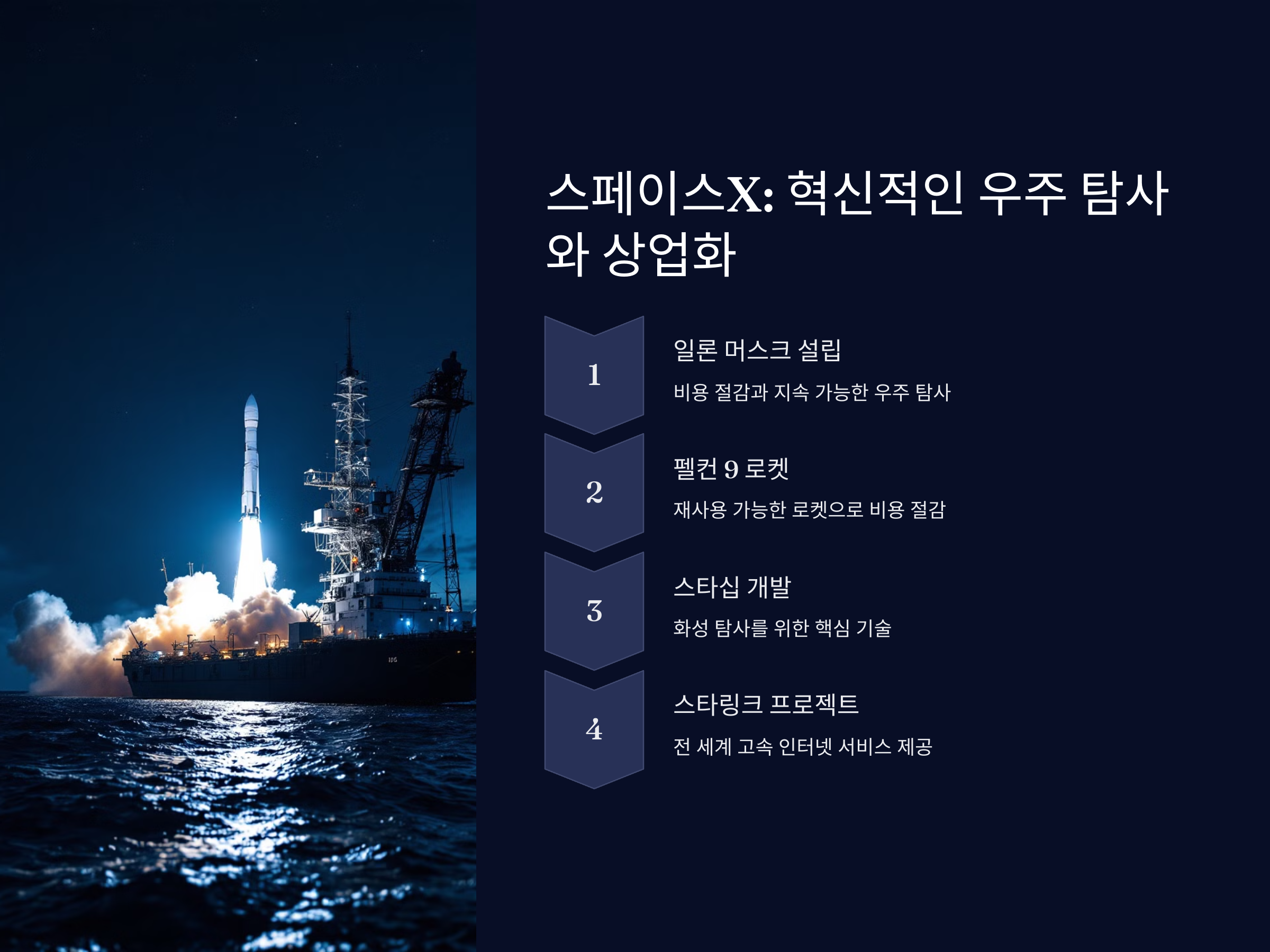 스페이스X는 일론 머스크가 설립한 우주 탐사 및 상업화 기업으로, 민간 우주 여행뿐만 아니라 우주 탐사를 위한 다양한 프로젝트를 진행하고 있습니다. 스페이스X의 가장 큰 특징은 '파헤칠 수 있는 비용 절감'과 '지속 가능한 우주 탐사'라는 목표 아래, 그들의 기술을 발전시켜 왔다는 점입니다.