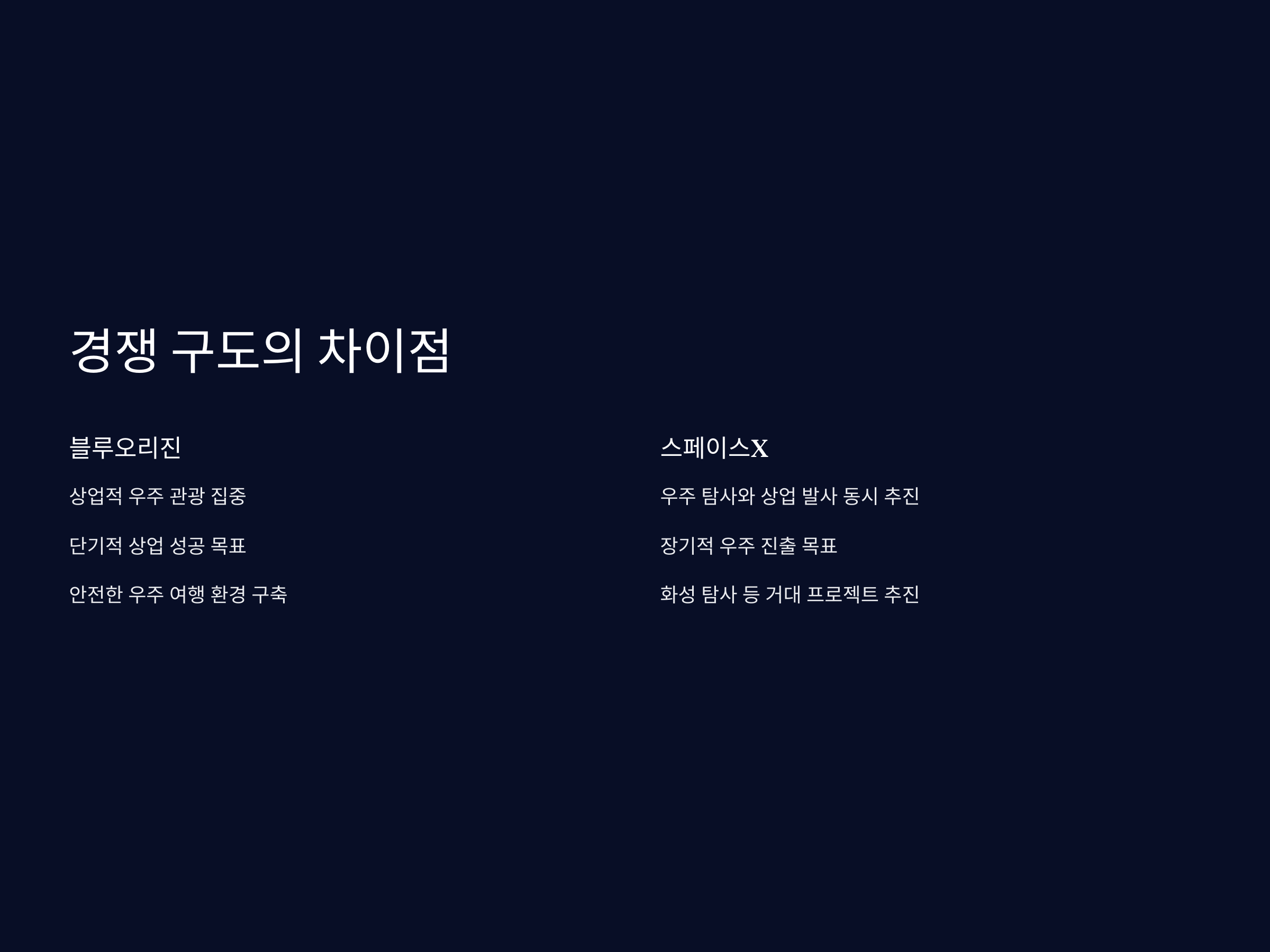 블루오리진과 스페이스X는 각기 다른 접근 방식으로 우주 산업을 이끌어가고 있습니다. 블루오리진은 주로 상업적인 우주 관광에 집중하고 있는 반면, 스페이스X는 우주 탐사와 상업적인 우주 발사를 동시에 추진하고 있습니다. 두 기업 모두 우주 산업의 혁신을 이끌고 있지만, 그들의 초점은 다릅니다.