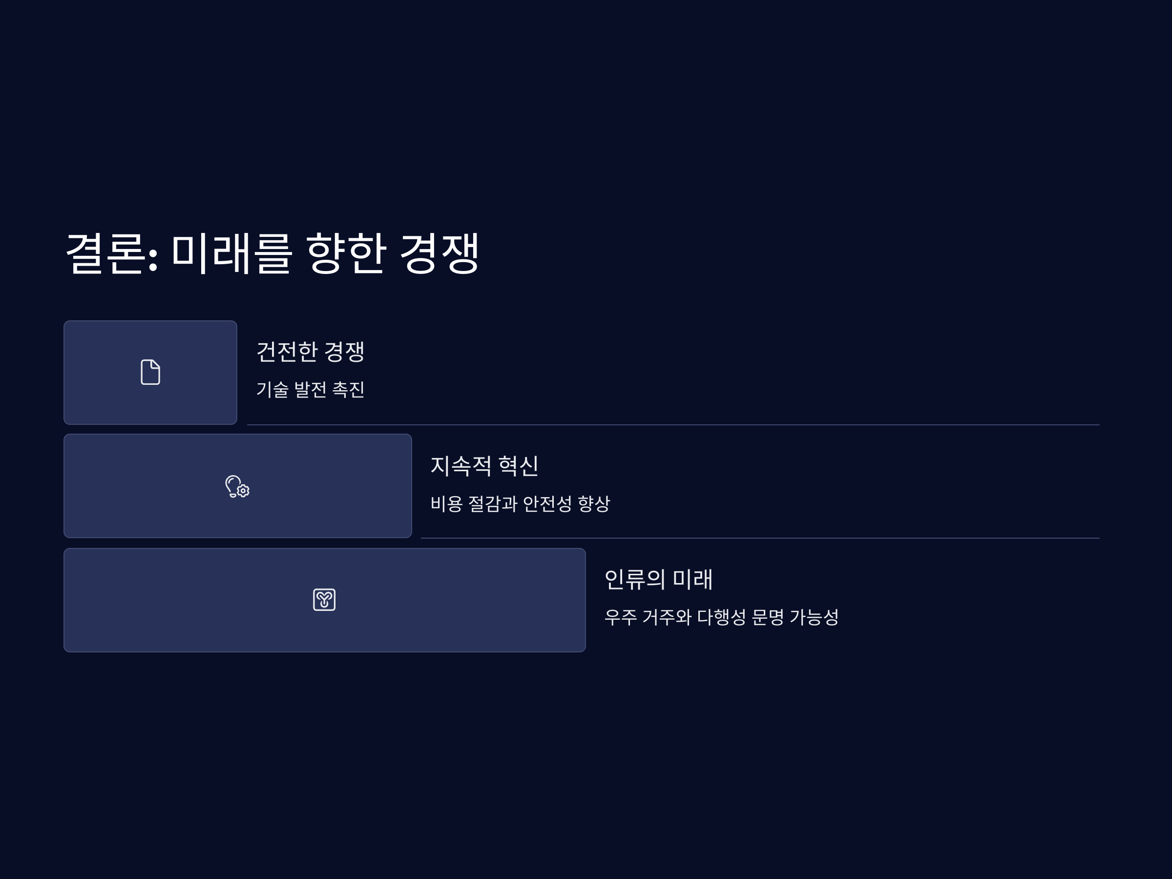 이 두 기업의 경쟁은 단순히 민간 우주 산업의 발전을 넘어서, 미래의 우주 거주와 우주 자원 개발 등 다양한 분야에서 중요한 변화를 예고하고 있습니다. 우주 산업이 더욱 발전하면서, 블루오리진과 스페이스X는 각각의 목표를 이루기 위한 끊임없는 혁신을 계속 추진할 것입니다.