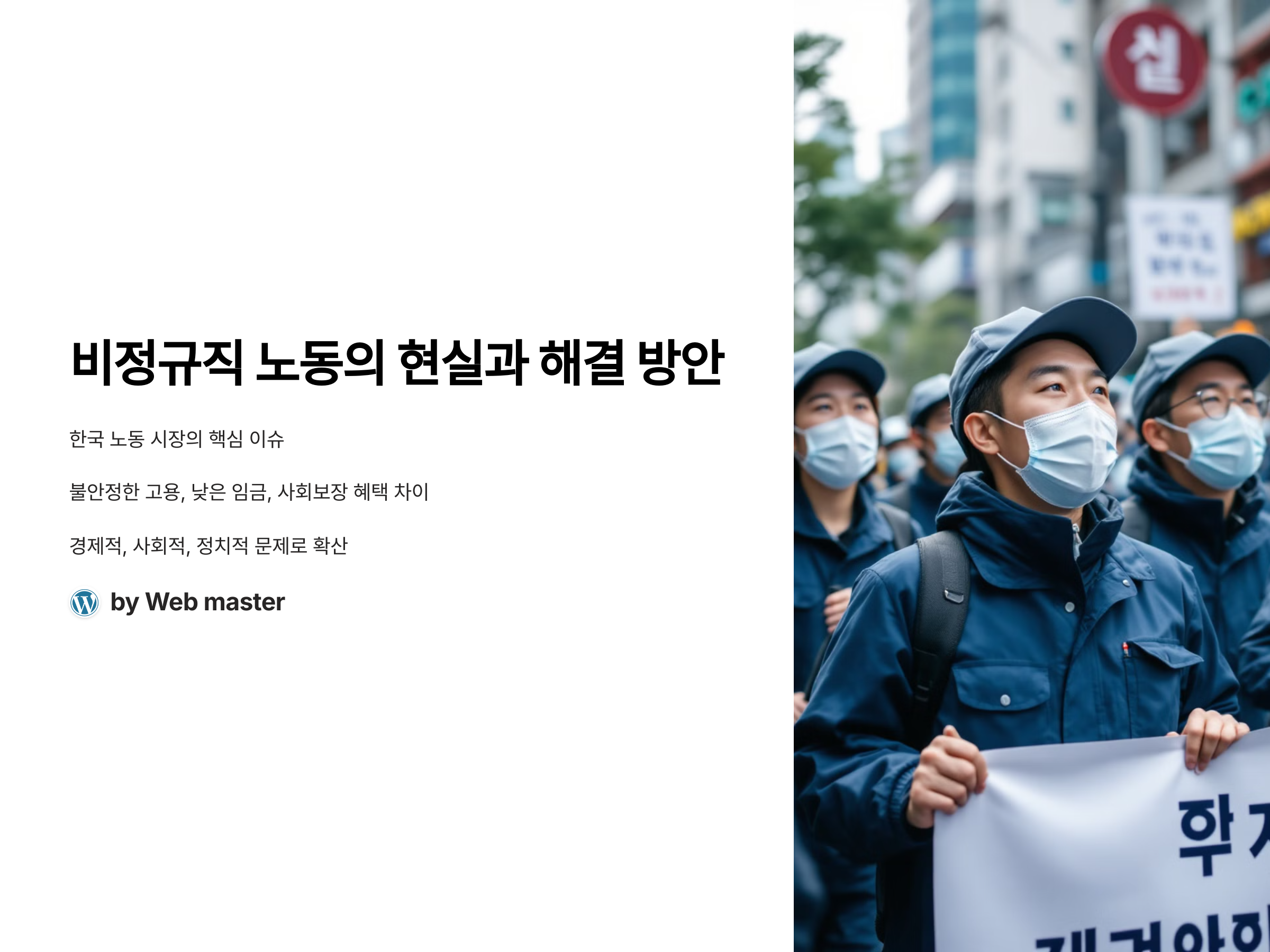 비정규직 노동 문제는 단기적으로 해결할 수 있는 문제가 아닙니다. 이 문제를 해결하기 위해서는 정부, 기업, 그리고 노동자들이 함께 노력해야 하며, 지속적인 개선과 변화가 필요합니다. 비정규직 노동자들이 안정된 고용 환경에서 일할 수 있도록 하는 것은 더 나은 사회를 만들기 위한 첫걸음입니다.