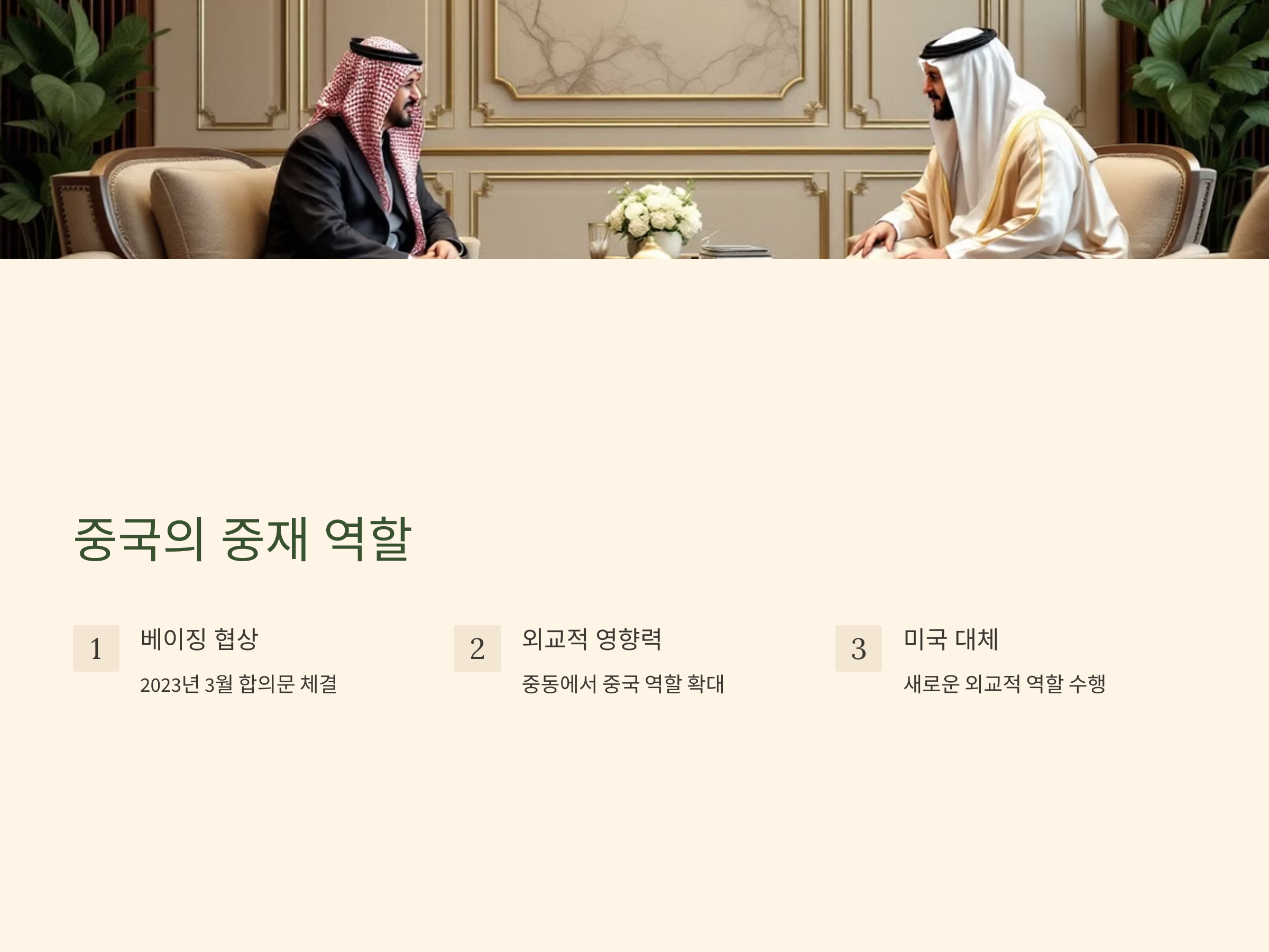 이번 사우디-이란의 관계 정상화 협상은 놀랍게도 중국의 중재 하에 이루어졌습니다. 중국은 2023년 3월, 베이징에서 열린 양국 간의 협상을 통해 합의문을 체결했습니다. 이로써 중국은 중동에서의 외교적 영향력을 크게 확장할 수 있는 기회를 잡았습니다. 중국은 미국을 대신하여 중동 지역에서 영향력을 행사할 수 있는 새로운 외교적 역할을 수행하게 되었으며, 이는 중동 국가들에게도 긍정적인 메시지를 전달했습니다【12†source】.