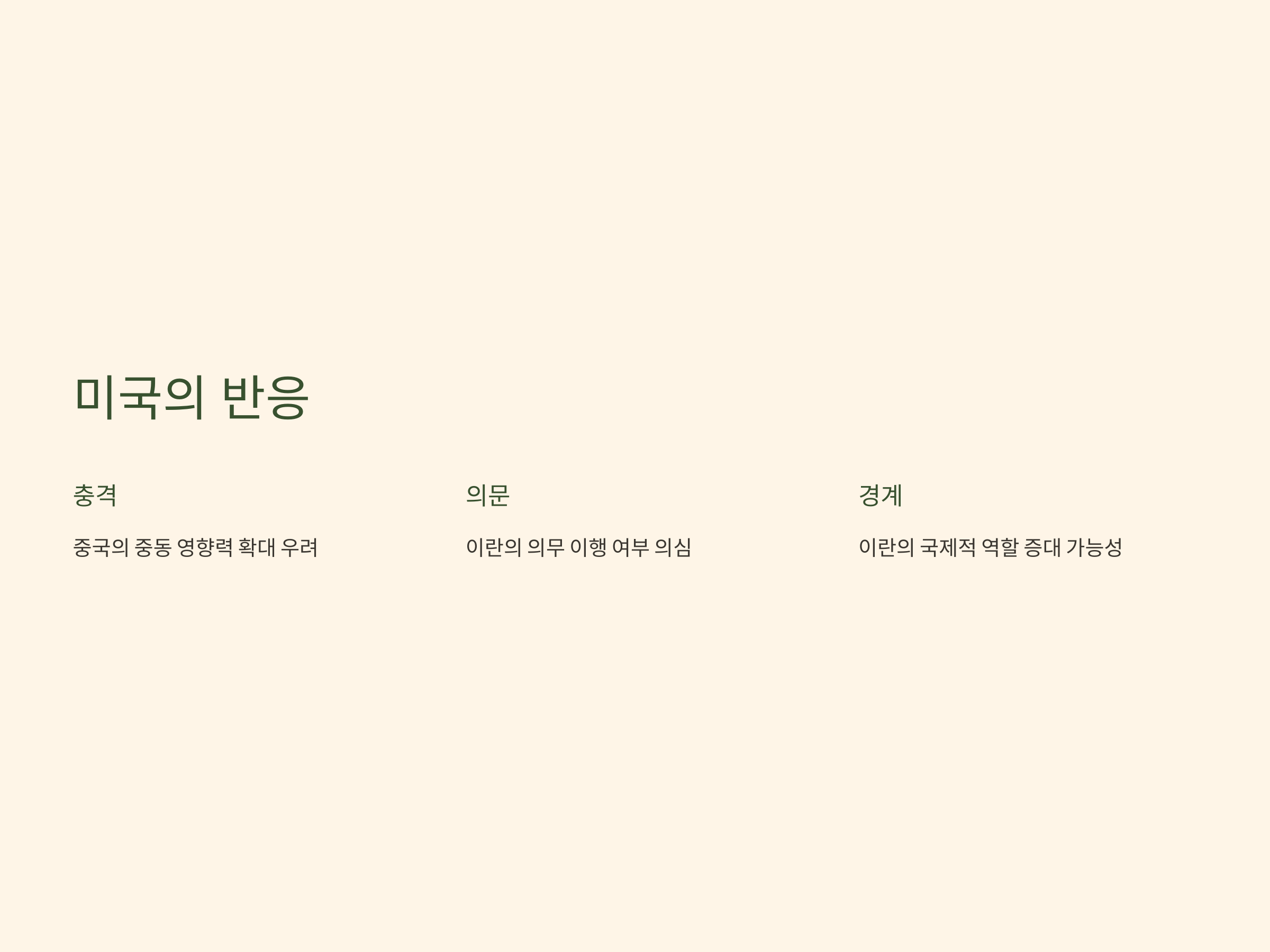 사우디와 이란의 관계 정상화 합의는 미국에게 큰 충격을 안겨주었습니다. 특히, 미국은 중국이 중동에서 미국의 자리를 대체할 가능성에 대해 우려를 표명하였고, 이란의 의무 이행 여부에 대해 의문을 제기했습니다. 미국은 이란의 핵 개발 프로그램에 대한 지속적인 우려와 함께, 이란이 향후 국제 사회에서 더욱 중요한 역할을 할 가능성에 대해 경계하고 있습니다. 이러한 국제적 반응은 향후 중동 지역의 외교적 기조에 중요한 영향을 미칠 것으로 예상됩니다【11†source】.