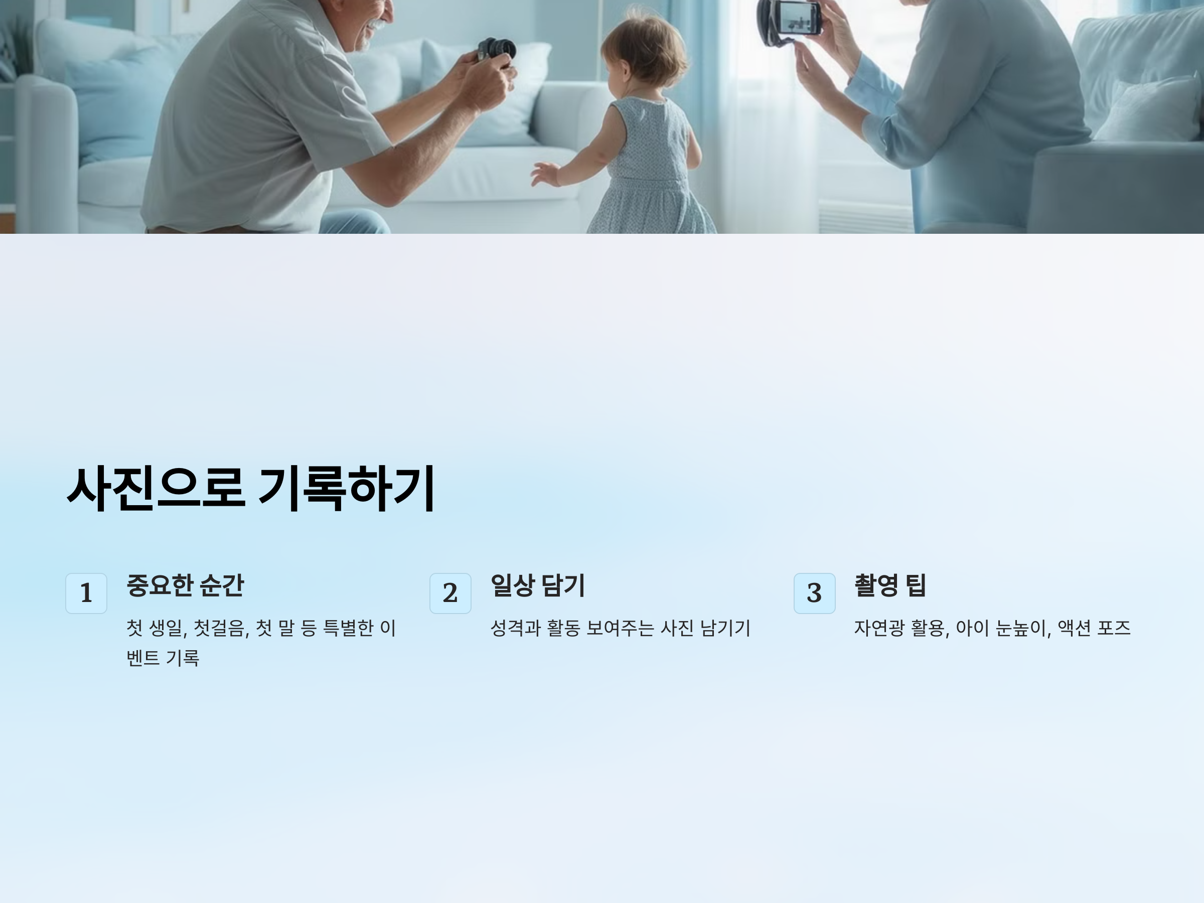 사진은 손주 성장 기록의 가장 기본적인 방법입니다. 매일, 혹은 특별한 순간마다 손주의 모습을 담아두는 것만으로도 시간이 흐른 후 그 당시의 감동을 되살릴 수 있습니다.