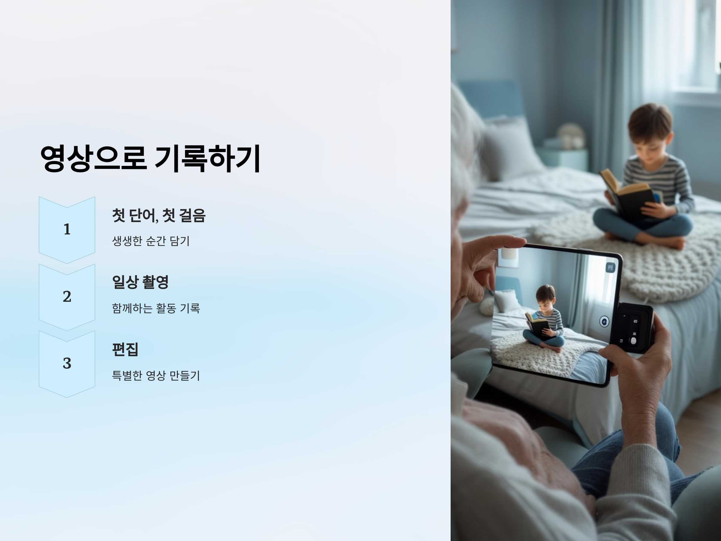 손주와 함께하는 일상적인 순간들을 영상으로 남겨보세요. 예를 들어, 손주가 좋아하는 동화를 읽어주는 모습, 함께 요리하는 모습, 공원에서 뛰어노는 모습 등을 찍으면, 그 당시의 분위기와 감정을 그대로 담을 수 있습니다. 또한, 영상은 사진과 달리 목소리나 주변 환경까지 녹음되므로 더욱 생동감 있게 손주의 성장을 기록할 수 있습니다.