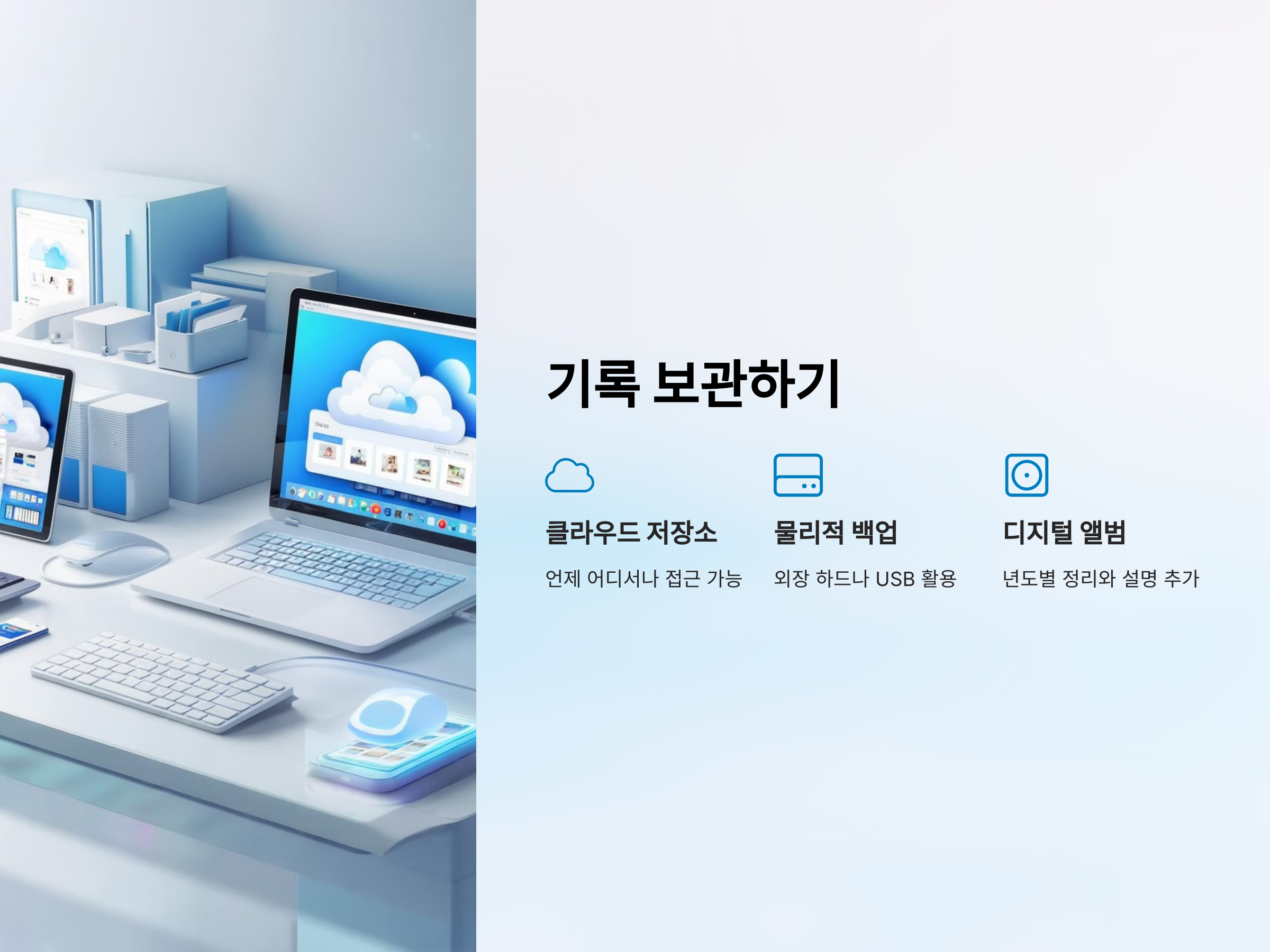 클라우드 서비스는 손주 사진과 영상을 저장하고 쉽게 공유할 수 있는 좋은 방법입니다. 구글 포토, iCloud, 드롭박스와 같은 서비스를 활용하면 언제 어디서든 손주들의 사진과 영상을 쉽게 확인할 수 있습니다. 또한, 이러한 클라우드 서비스는 자동 백업 기능이 있어 사진이나 영상이 손실되는 걱정을 덜 수 있습니다.