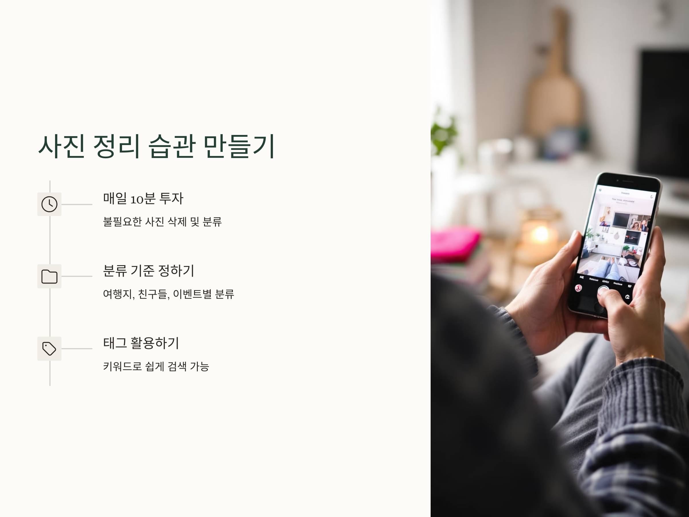 사진을 쉽게 정리하는 스마트폰 활용법은 스마트폰 내장 기능과 앱을 효과적으로 활용하는 것에서부터 시작됩니다. 매일 조금씩 사진을 정리하는 습관을 들이고, 클라우드 저장소와 사진 관리 앱을 활용하면, 사진을 더 쉽게 정리하고 관리할 수 있습니다. 이를 통해 저장 공간을 절약하고, 필요 없는 사진들을 삭제함으로써 더욱 깔끔한 사진 보관이 가능합니다.