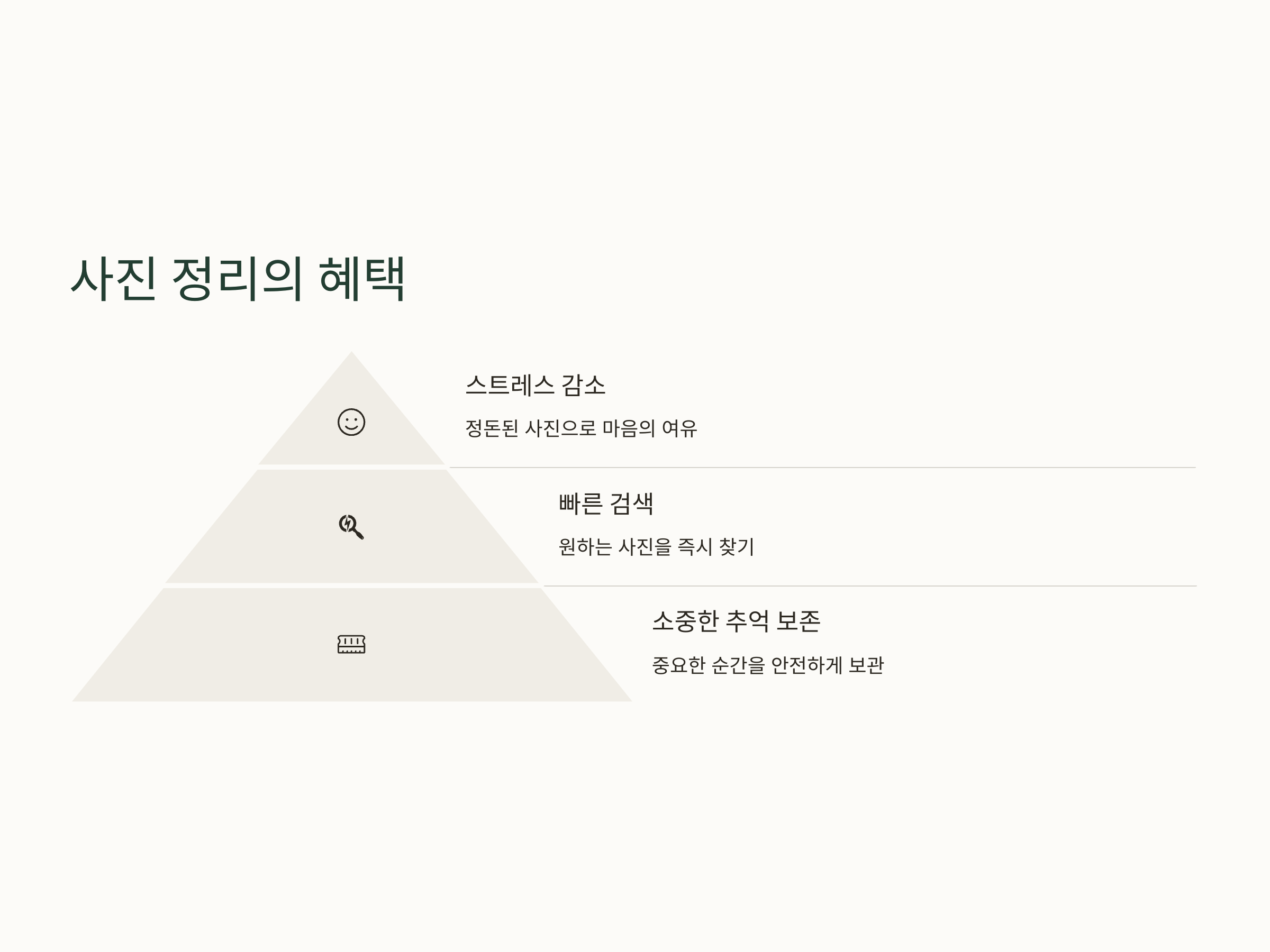 사진을 정리하는 가장 중요한 팁은 정리 습관을 만드는 것입니다. 수백 장의 사진을 한꺼번에 정리하려면 시간이 오래 걸리고, 그만큼 스트레스를 받을 수 있습니다. 그래서 주기적으로 사진을 정리하는 습관을 들이면, 사진을 관리하는 일이 훨씬 수월해집니다.