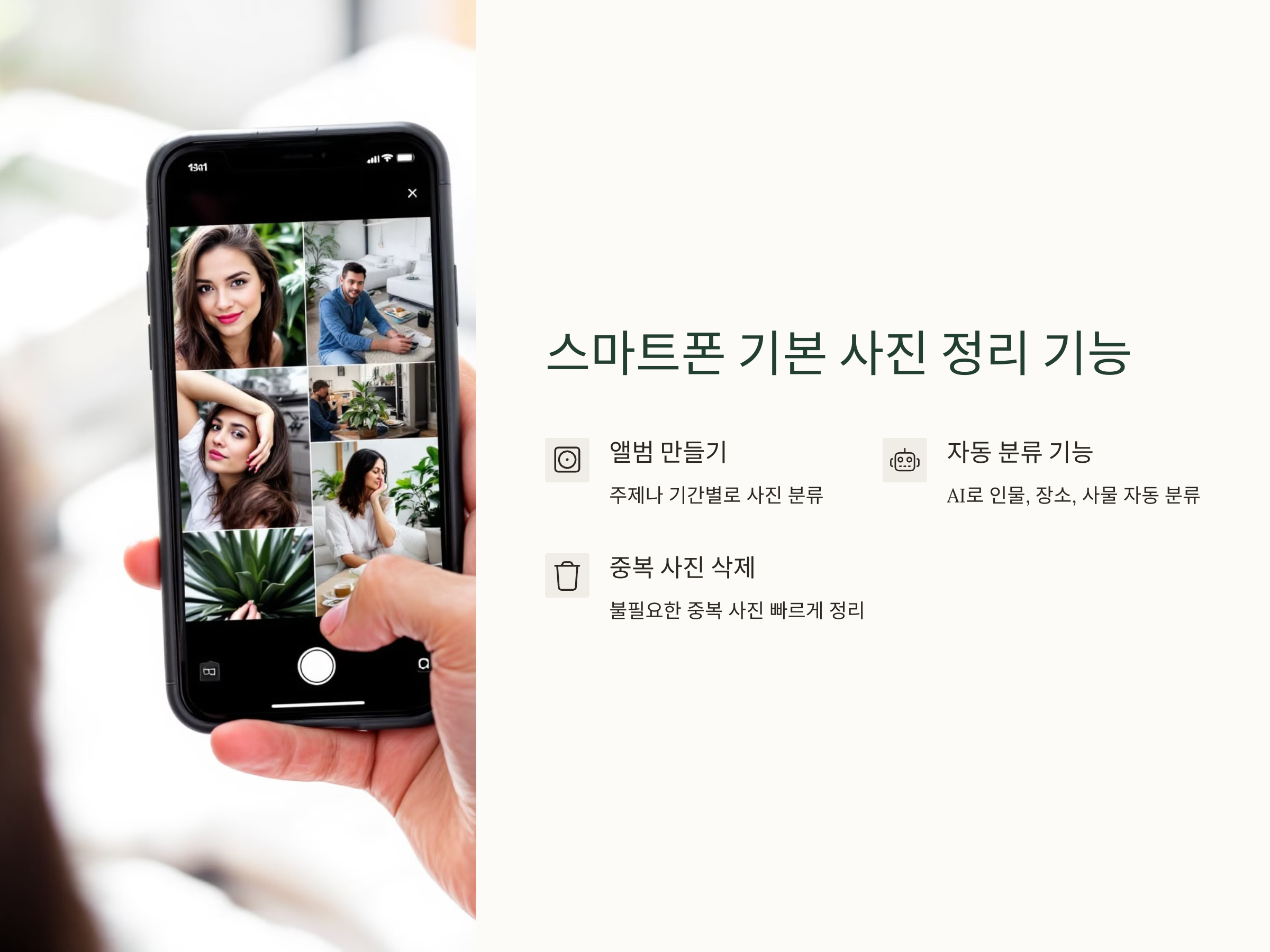 최신 스마트폰에는 AI 기능이 탑재되어 있어 사진을 인물, 장소, 사물 등을 자동으로 분류해 줍니다. 이를 통해 원하는 사진을 키워드로 쉽게 찾을 수 있습니다.