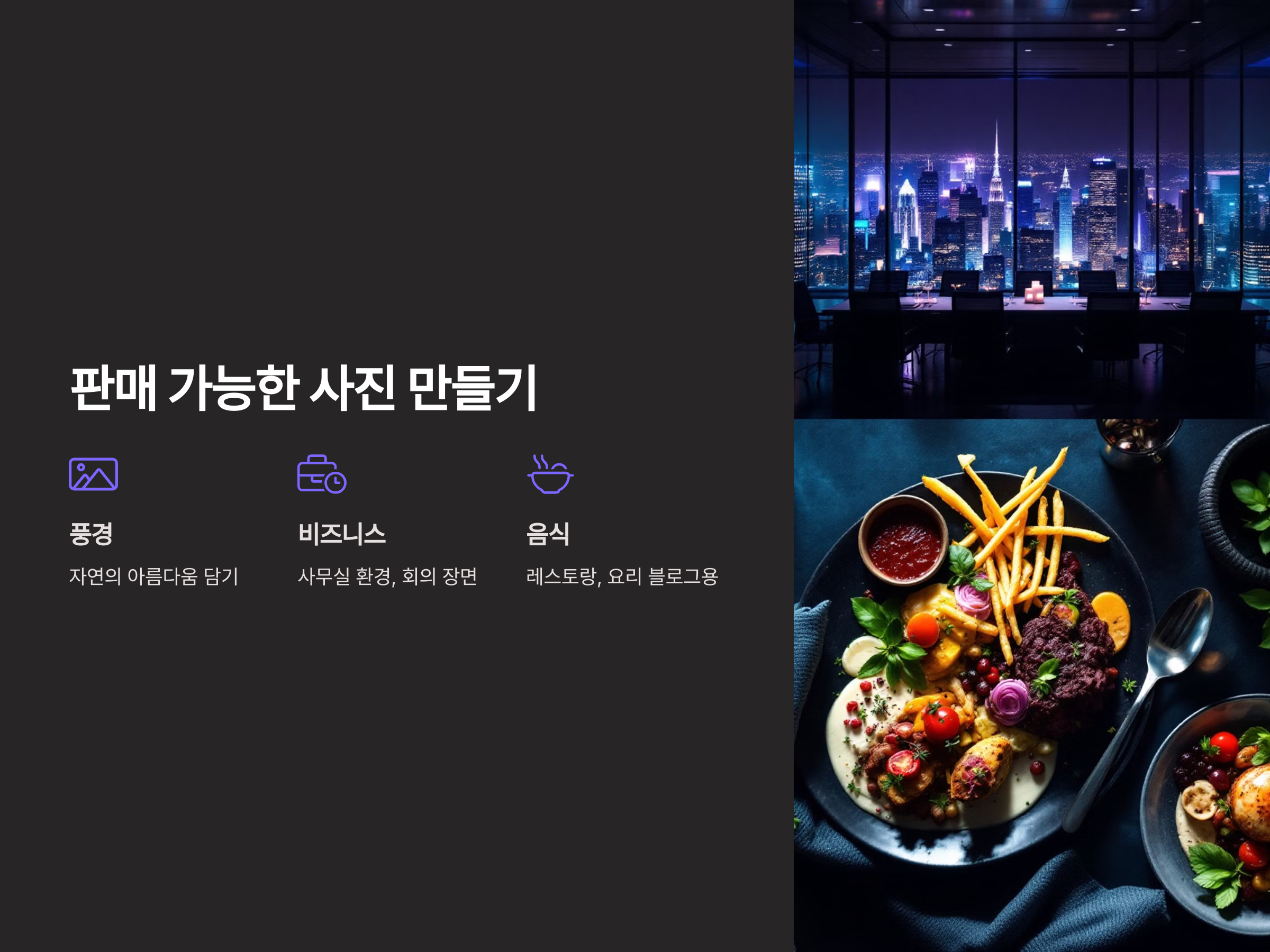 - 음식 사진: 음식 사진은 레스토랑, 요리 블로그, 마케팅 등에서 자주 활용됩니다.