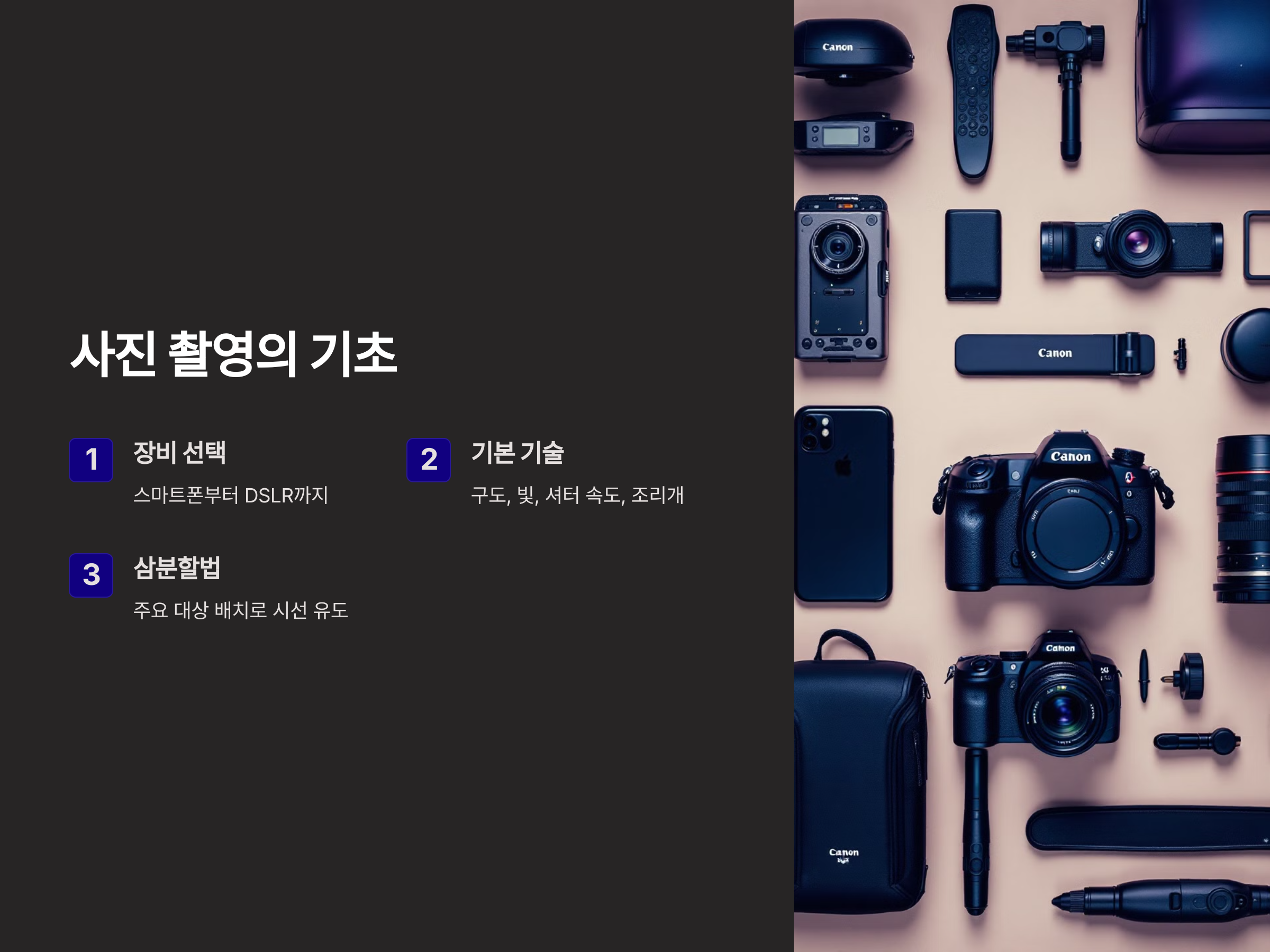 사진 촬영을 시작하려면, 우선 장비와 기초적인 기술을 이해하는 것이 중요합니다. 처음에는 스마트폰을 이용해도 충분하지만, 점차 카메라 장비나 렌즈, 조명 등 전문적인 도구를 사용하면 더 다양한 사진을 촬영할 수 있습니다.
