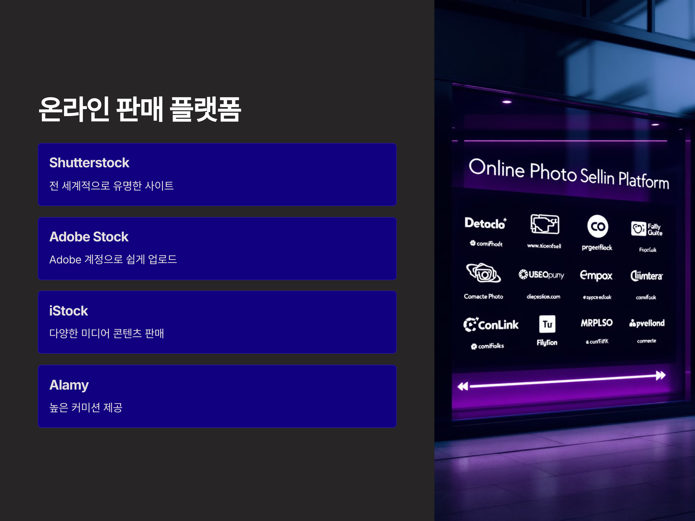 사진을 촬영한 후, 이를 판매할 수 있는 온라인 플랫폼을 선택해야 합니다. 여러 가지 사진 판매 플랫폼이 있으며, 각 플랫폼마다 판매 방식이나 조건이 다릅니다. 자신에게 맞는 플랫폼을 선택하는 것이 중요합니다.