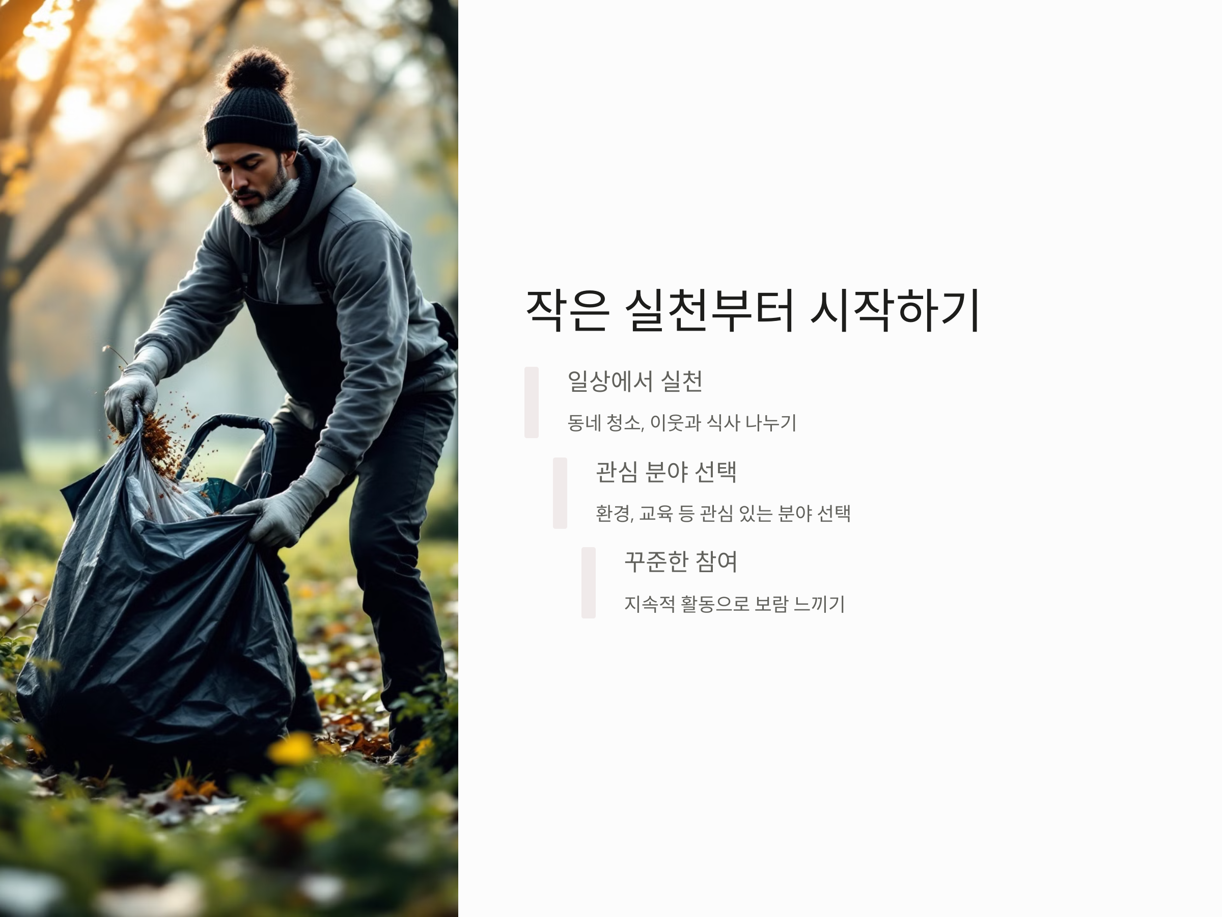 사회 공헌 활동을 시작하려면 특별한 능력이나 많은 자원이 필요한 것은 아닙니다. 소소한 일상에서 실천할 수 있는 작은 행동들이 사회적 기여로 이어질 수 있습니다. 예를 들어, 동네의 청소 활동에 참여하거나, 도움이 필요한 이웃에게 식사를 나누는 것부터 시작할 수 있습니다. 처음에는 작고 간단한 실천이라 할지라도, 이런 작은 행동들이 모여 큰 변화를 일으킬 수 있습니다.